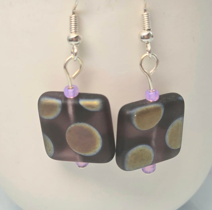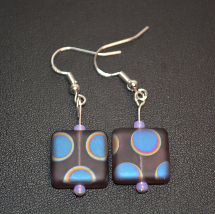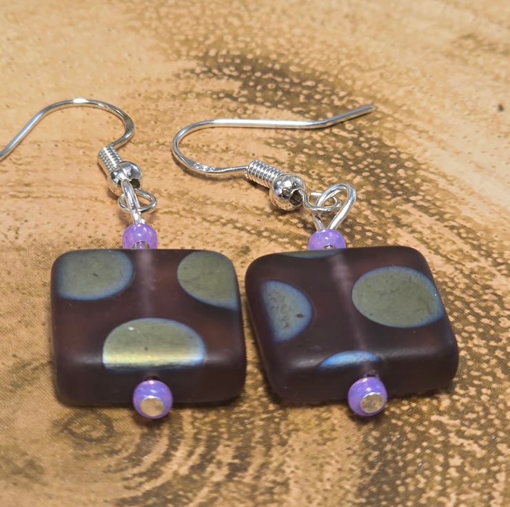 The earrings have been made using very Grape matt square czech glass beads with a peacock patton. The location of the peacock patton can vary in location and colour on the squares beads. I've matched them together as best as possible. The squares beads have a light purple seed bead above and below.