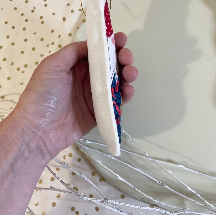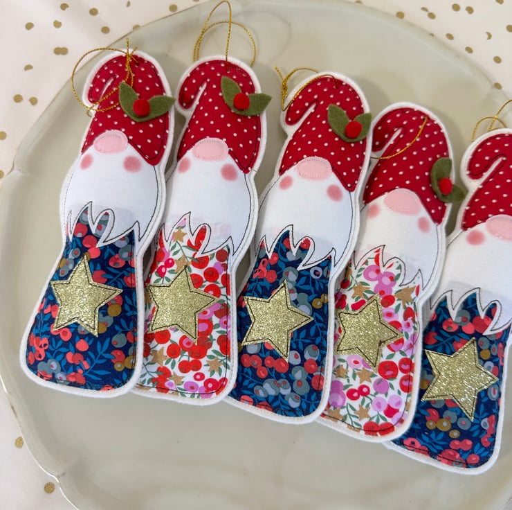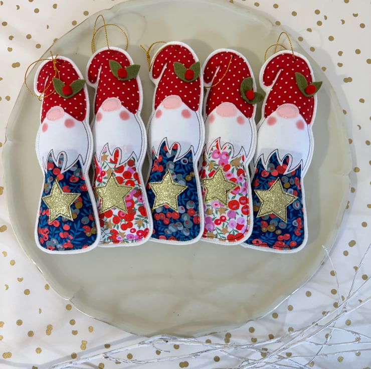I’ve free motion embroidered a fun gonk, complete with pretty Liberty fabric, sparkly star and rosy cheeks. The gonks are 100% filled with lavender and are backed with natural wool felt.