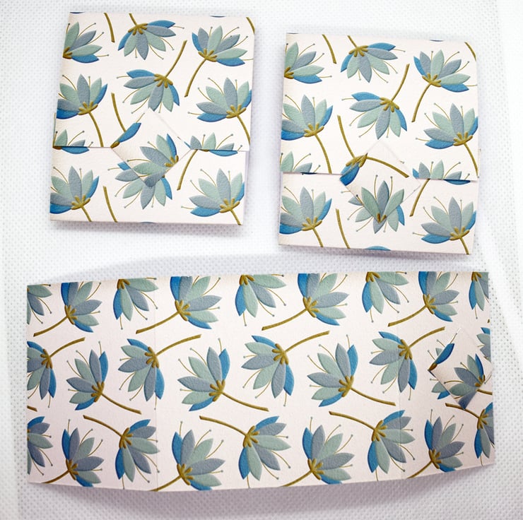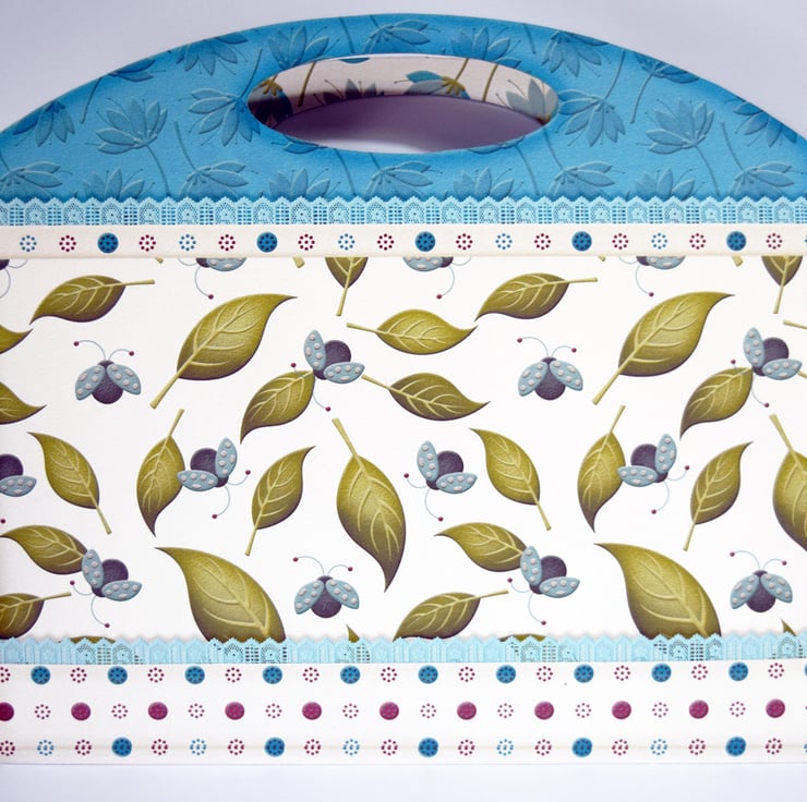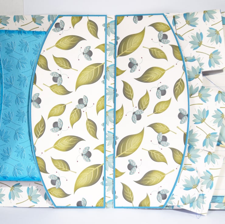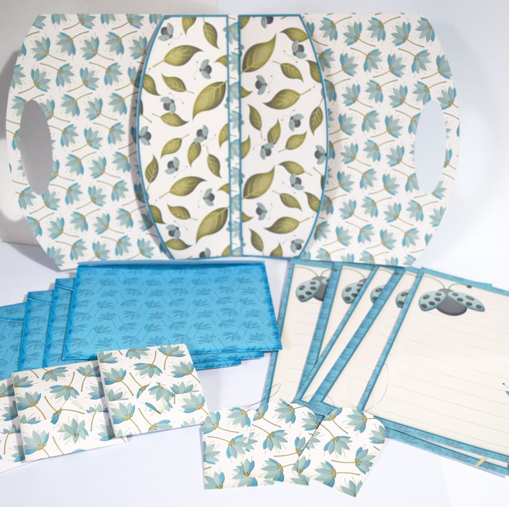 A beautiful handcrafted stationery folder with gorgeous blue ladybird pattern contains: