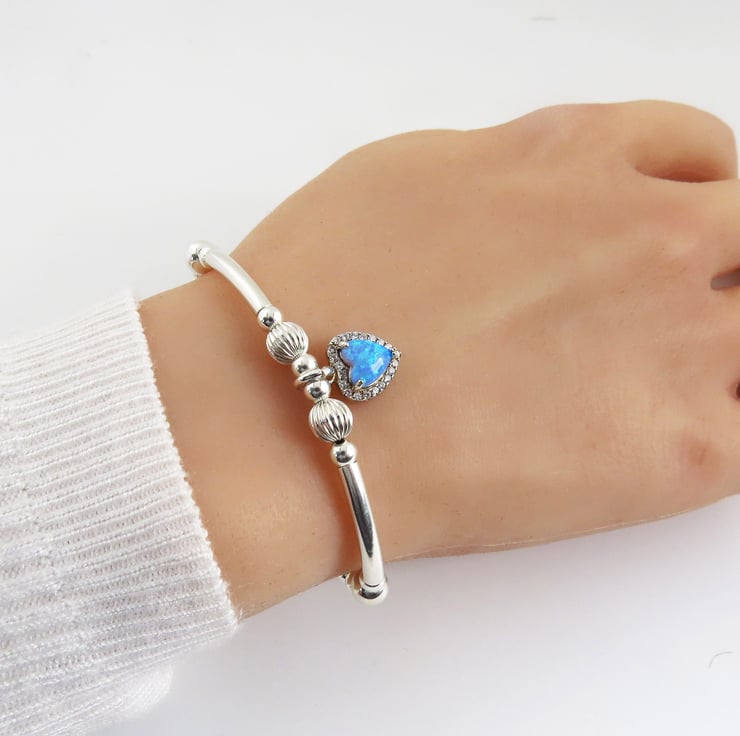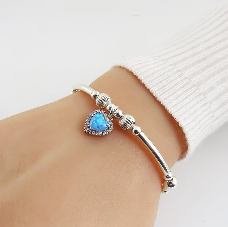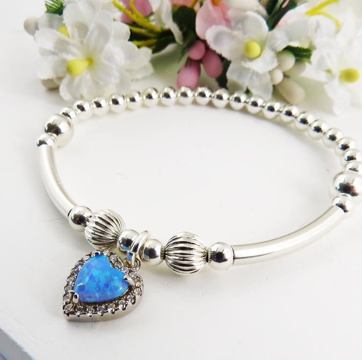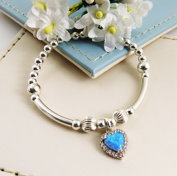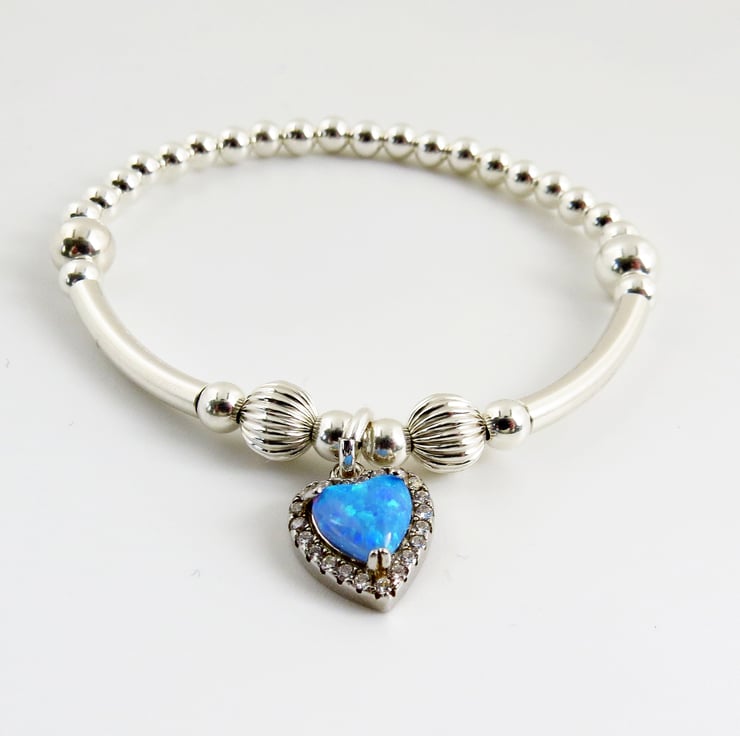 Something blue for the bride this stunning blue opal charm that adorns this sterling silver bead stretch bracelet makes the perfect gift. This bracelet will also make a stunning gift for your bridesmaids. Also deal for every day wear and makes a lovely keepsake gift.