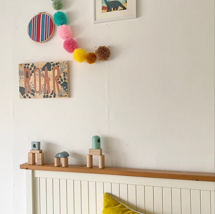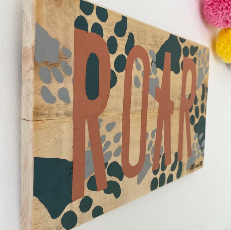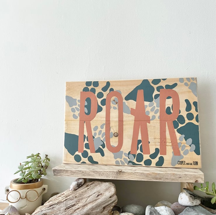 Beautiful multi coloured dinosaur skeletal footprint wooden sign with dusky pink ‘ROAR’