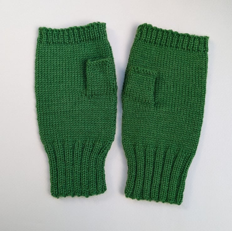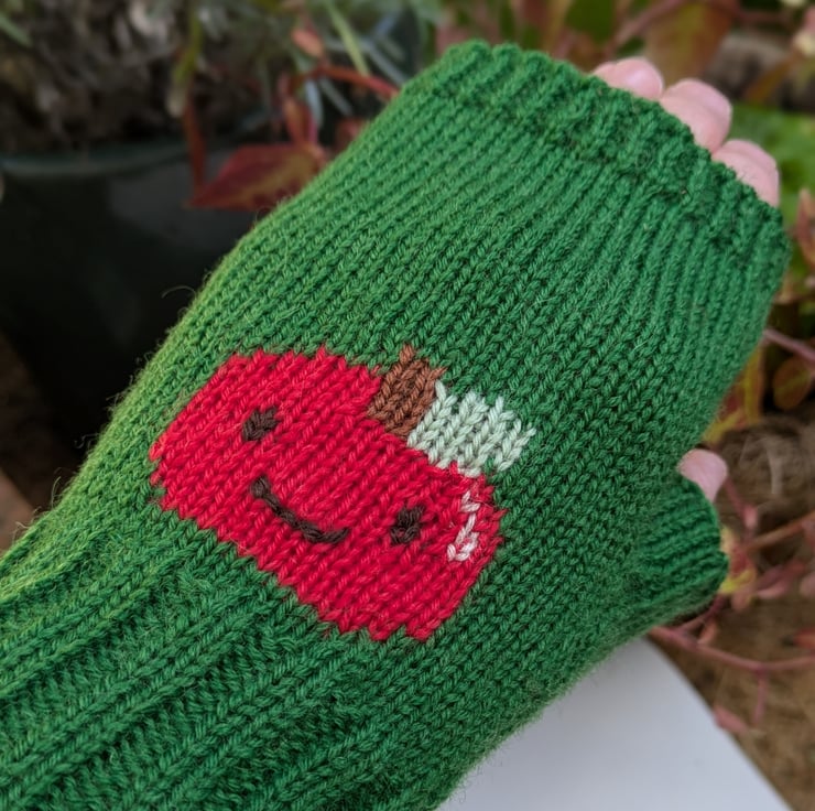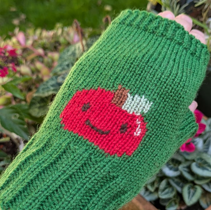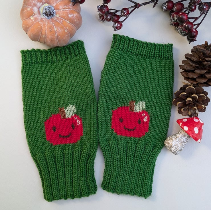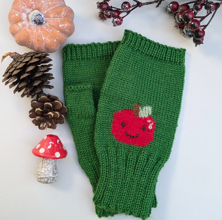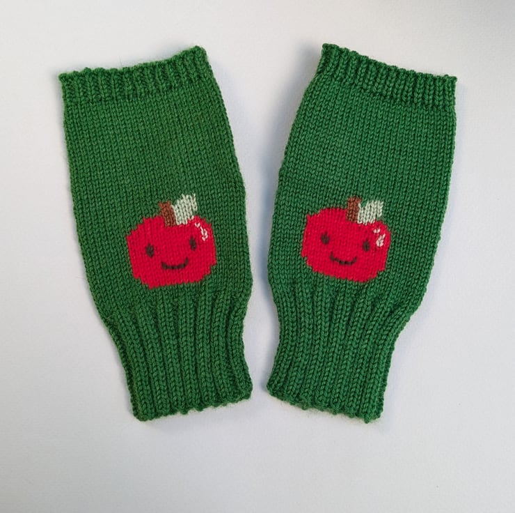 Fingerless gloves knitted in 4ply merino wool, with a fun apple motif on the front. These wrist warmers are knitted using the intarsia knit method giving a graphic colourful design. Great to wear on cold days to keep hands warm but fingers free for tasks.