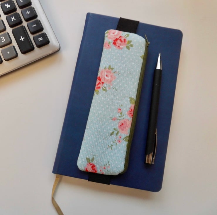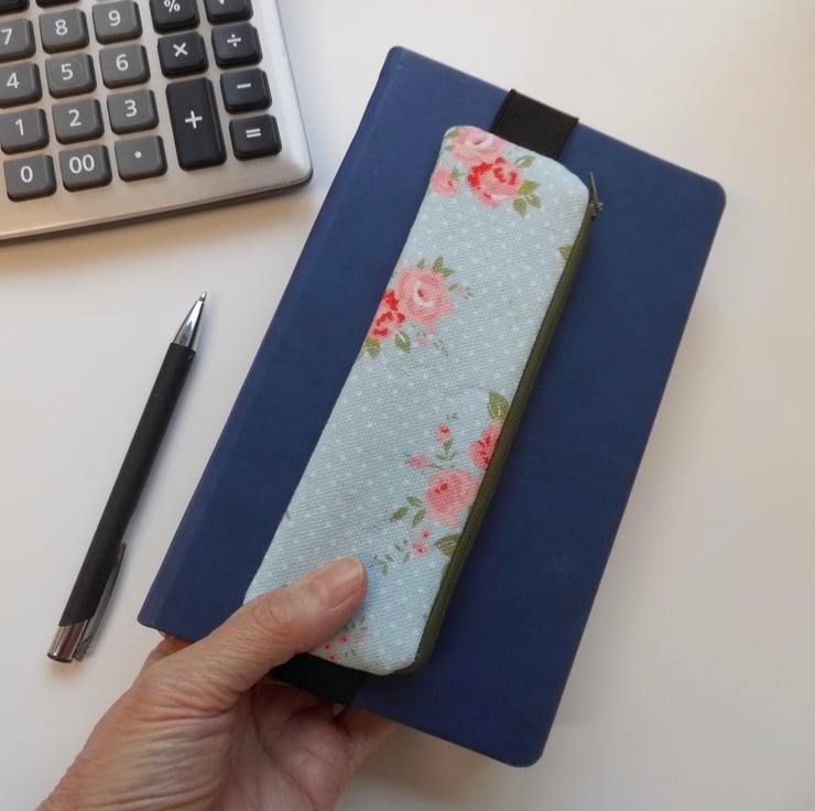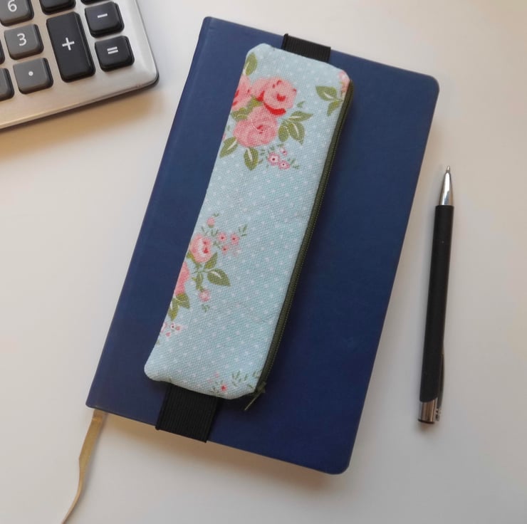 A mini pencil case designed to be kept on the front cover of your diary or journal, held in place with an elastic strap. Just slip it on the front cover and you can always have a pen and pencil to hand. Add it to whichever notebook you are using for the day.