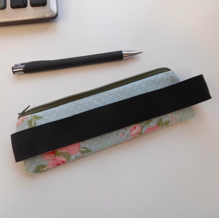 It has an olive green zip across the top. The elastic is black and 23mm wide. The pencil case measures about 17 cm x 4.5 cm and I have shown it here on the cover of a book 21cm tall and it fits perfectly.