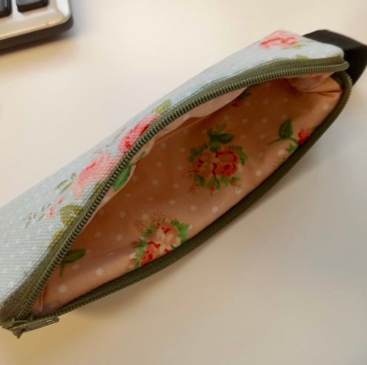 This pencil case has been made from a furnishing weight cotton fabric which has a blue background with white spots and vintage style pink floral print. I backed this fabric with fusible fleece and then machined three lines of wave stitch on each side to make it slightly quilted. Lined with a pink floral and spot cotton which coordinates perfectly.
