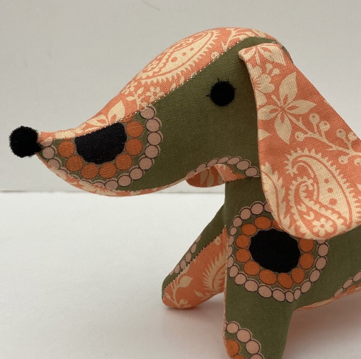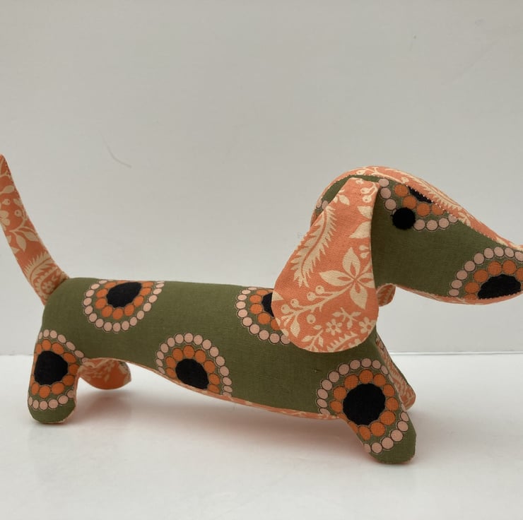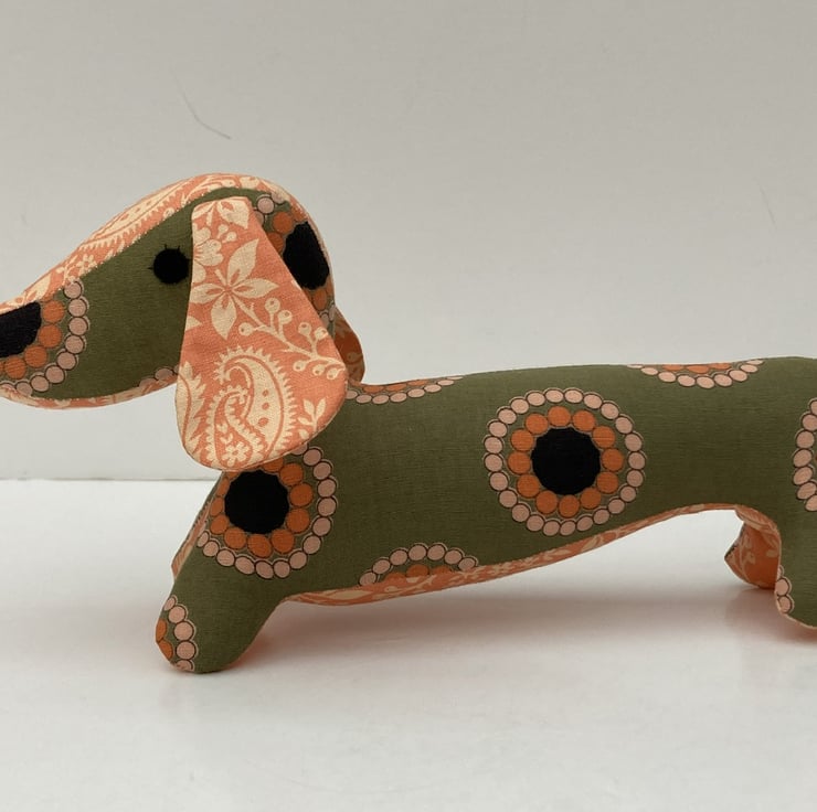 Snossage The Vintage Fabric Sausage Dog.   (Green and orange)