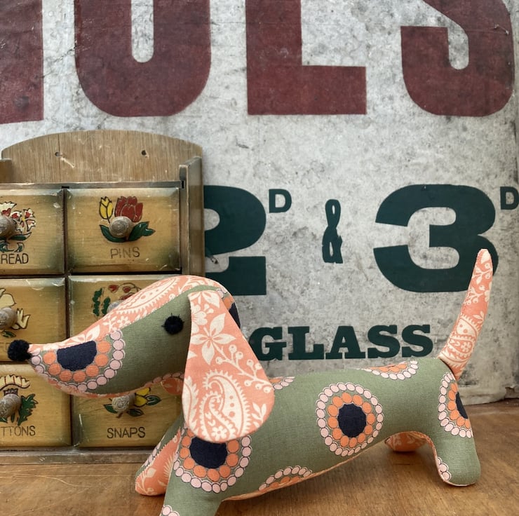 Snossage The Vintage Fabric Sausage Dog. (Green and orange)