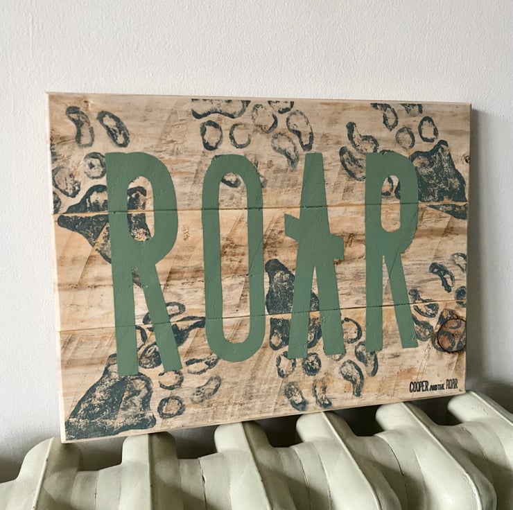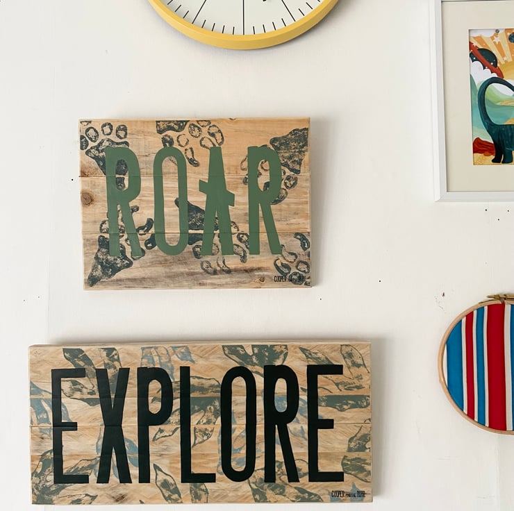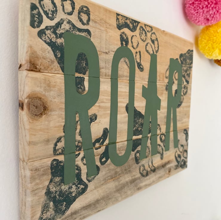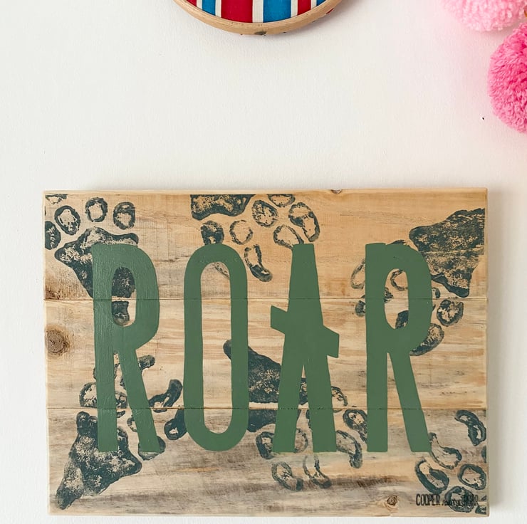 Beautiful dinosaur skeletal footprint wooden sign with natural wood background, deep blue/grey footprints and ‘ROAR’ in chalky green.