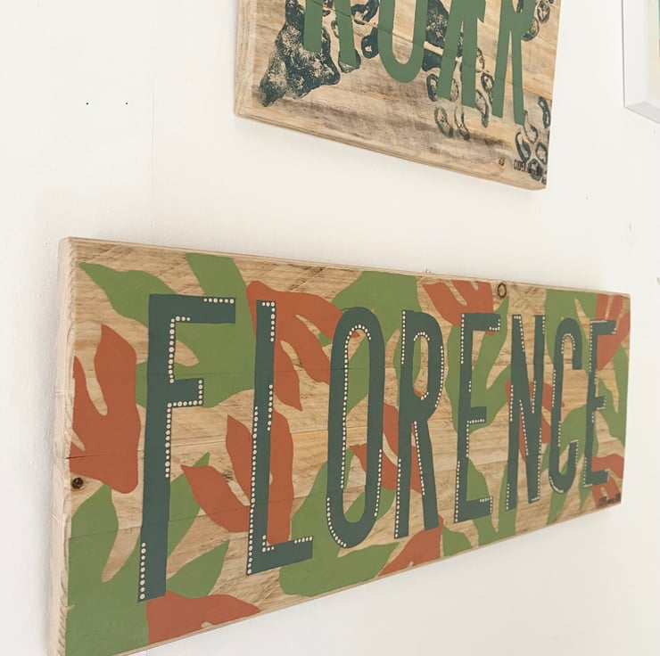 All my signs are handmade from start to finish from my initial selection of timber to drawing and cutting my own stamps. I select timber that hasn’t been planed and whilst sanding I like to keep all of the knots and textures which make each sign unique in feel. Each sign is hand stamped and painted using beautiful natural colours and finished with matt varnish.