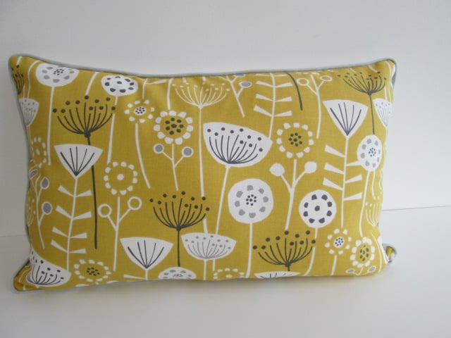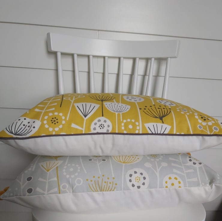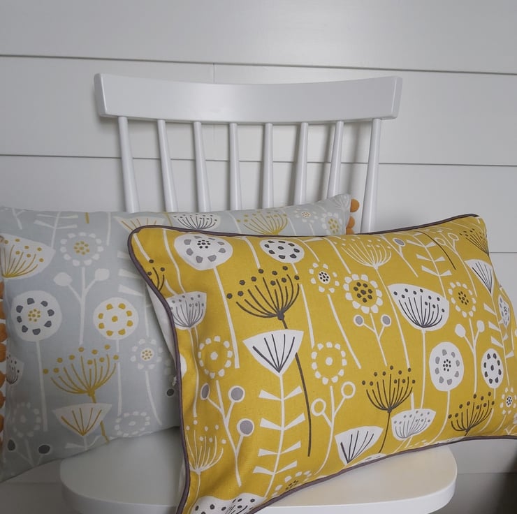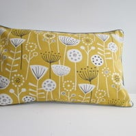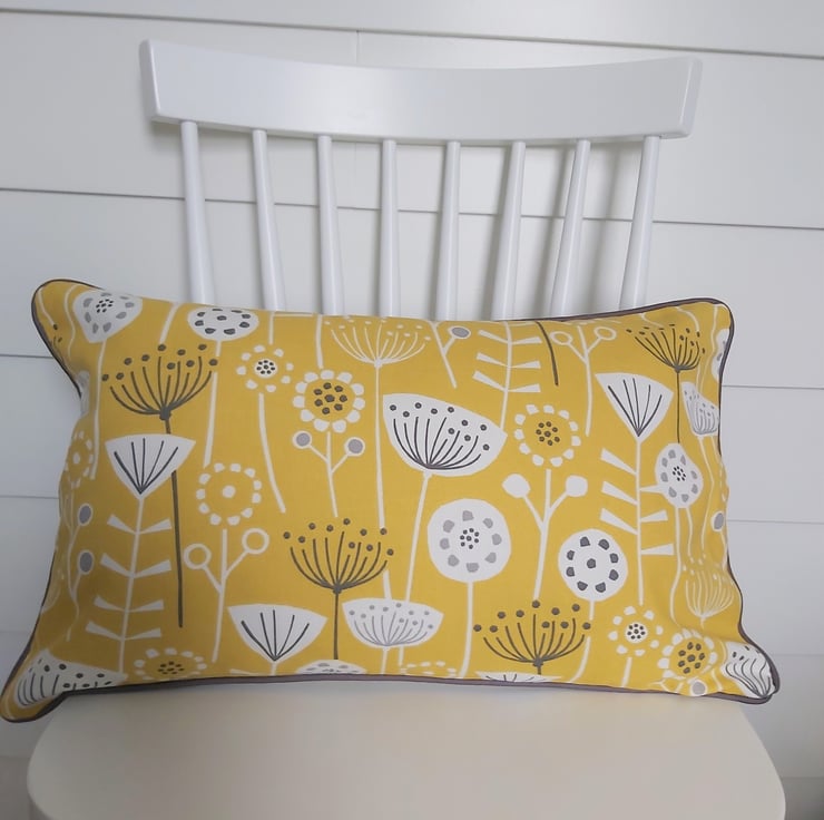Mustard seedheads fabric cushion cover with back zip and grey piping.