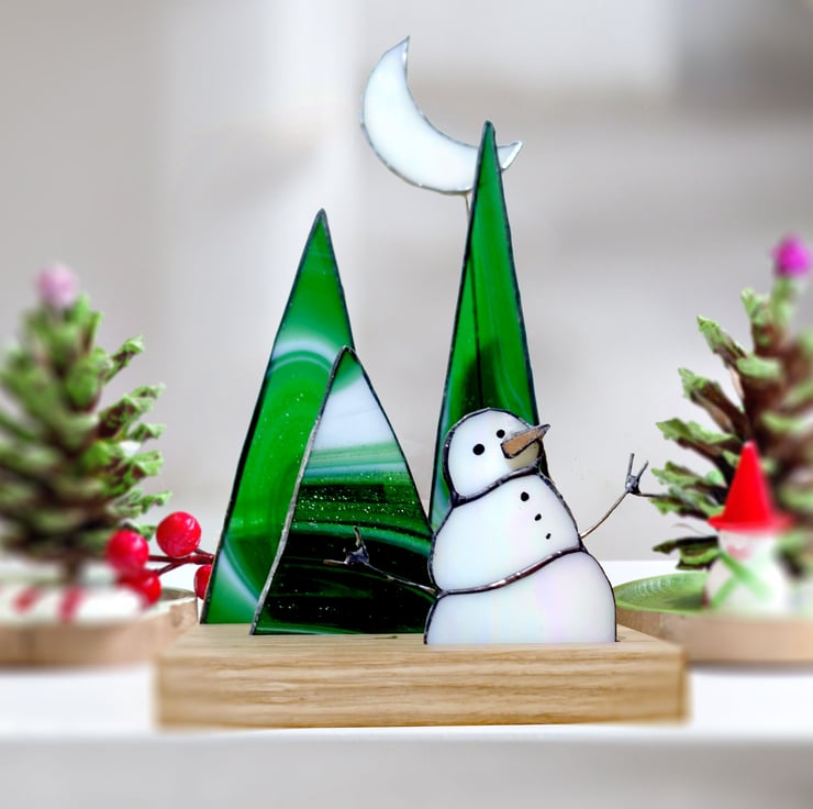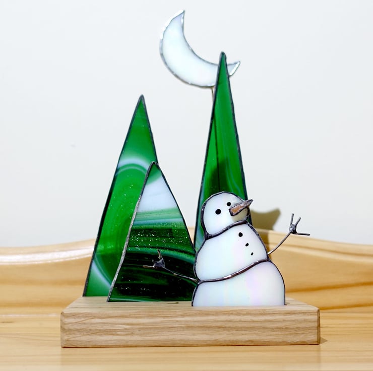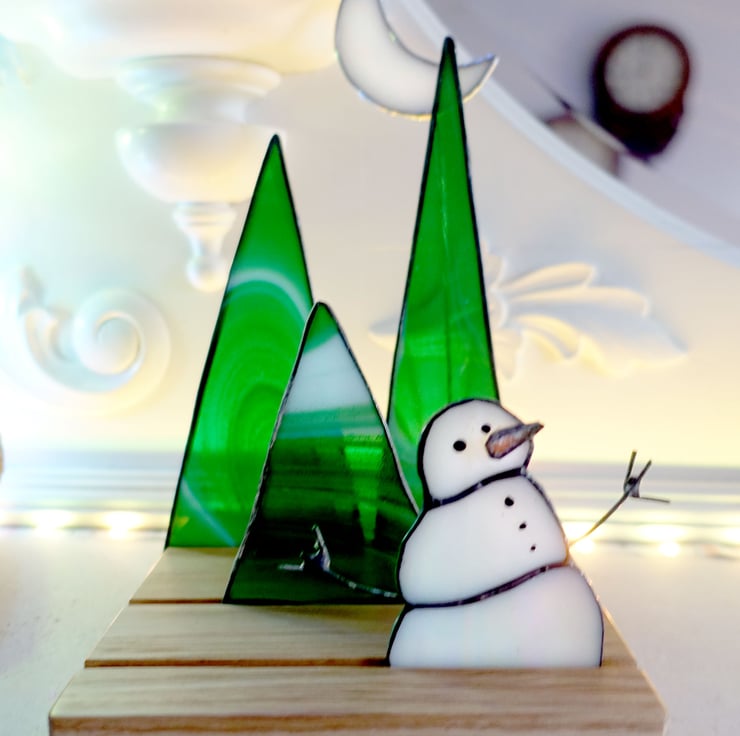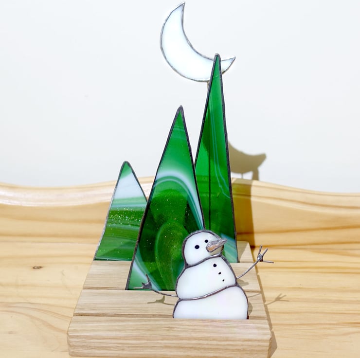 This 5 piece 3D stained glass art ornament is designed to be interchangeable and lit by tealights. The fir trees are made from a glass called Opal which has the unique quality of being embedded with sparkly mica, so the trees have a frosty appearance. The crescent moon is made from white iridescent glass as is the snowman.