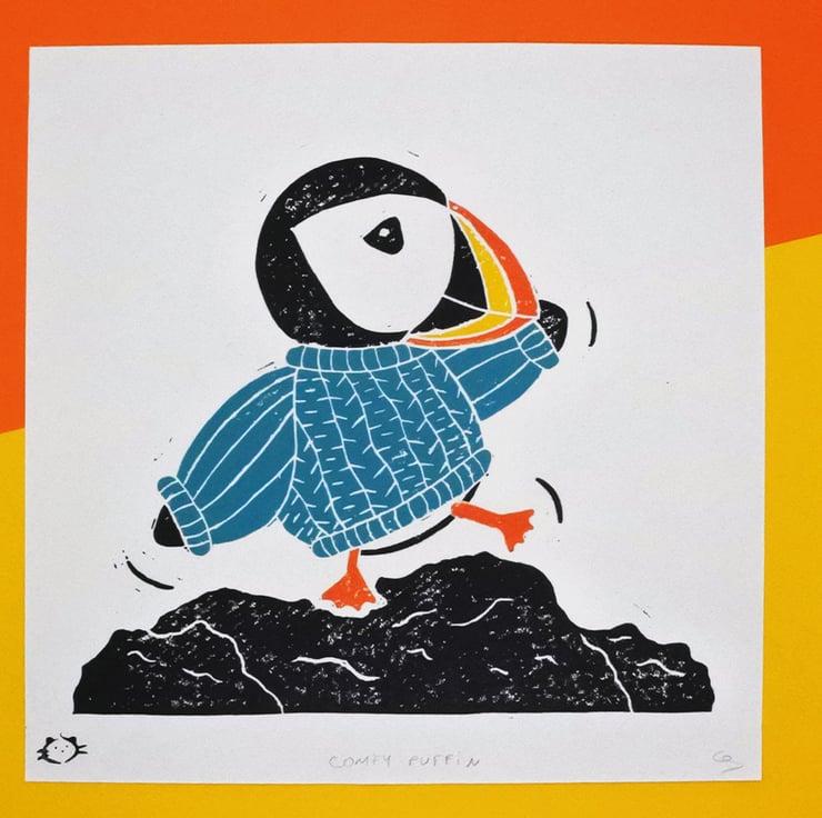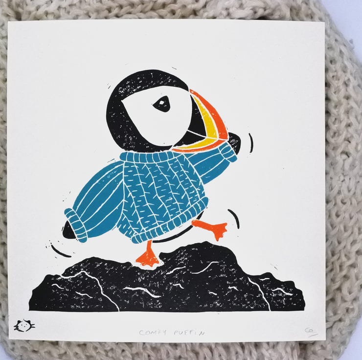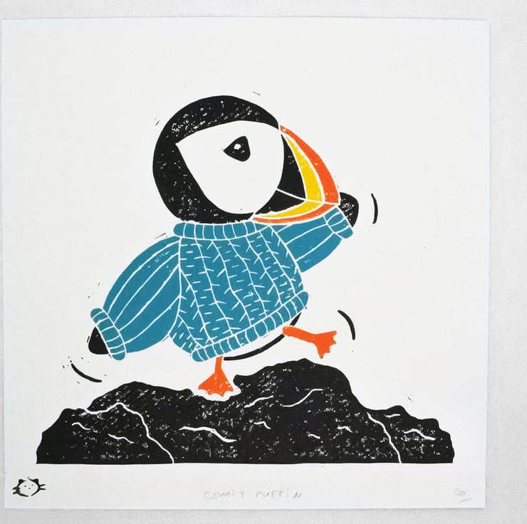 This cute puffin in keeping warm on the windy seaside with its knitted sweater! Almost life sized, this block print will brighten up a blank wall on a bedroom.
