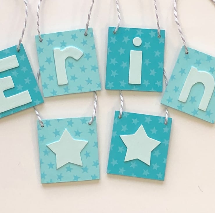 Each individually hung lettered piece measures approximately 5cm square and is hand painted with a decorative finish to match the end piece design (Hearts with hearts and stars with stars) in the featured colour theme.