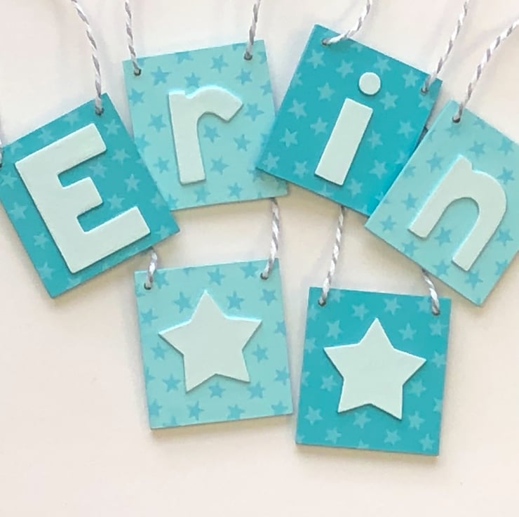 Personalised bunting in shades of turquoise, available with a choice of heart or star design end pieces.