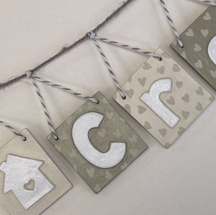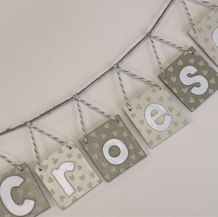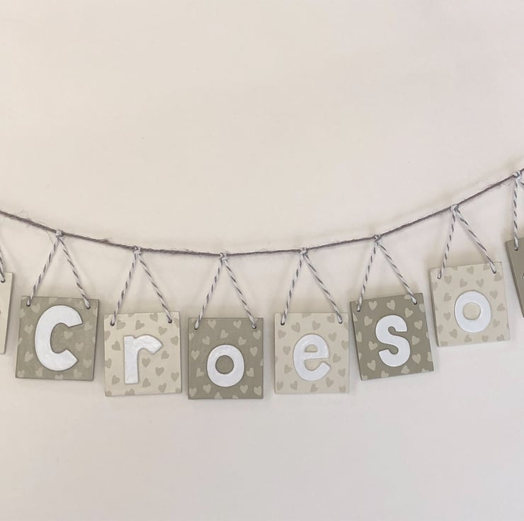 Wooden bunting hanging sign spelling "Croeso" (Welsh, meaning Welcome) with heart design end pieces
