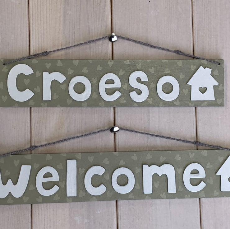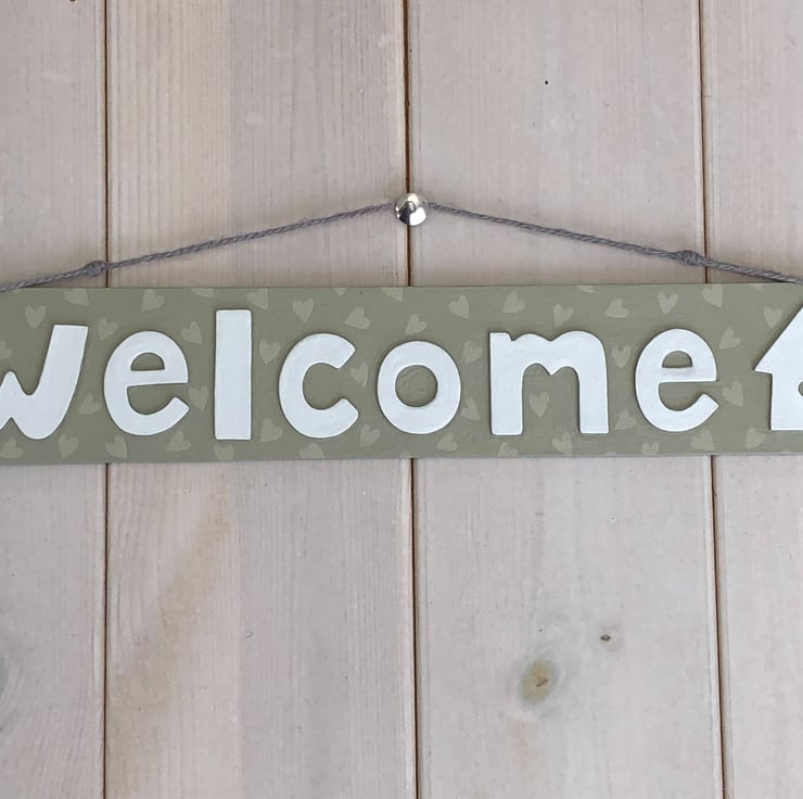 Welcome door sign measuring 29cm x 5cm. Hand painted in a olive green heart design, strung with natural twine.