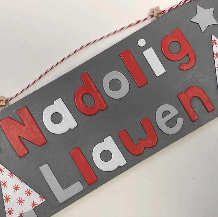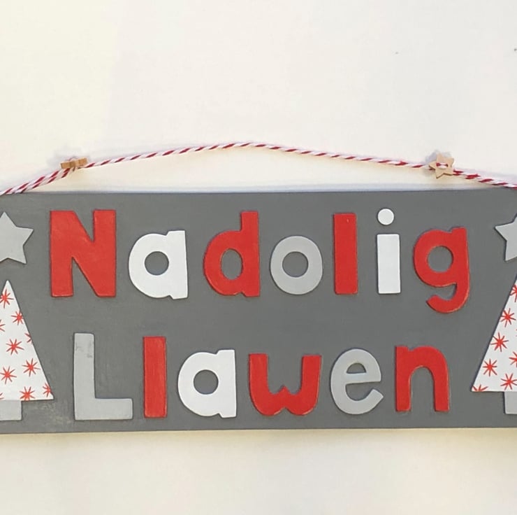 Hanging decorative sign in festive design spelling out "Nadolig llawen" meaning Happy Chrismas in Welsh.