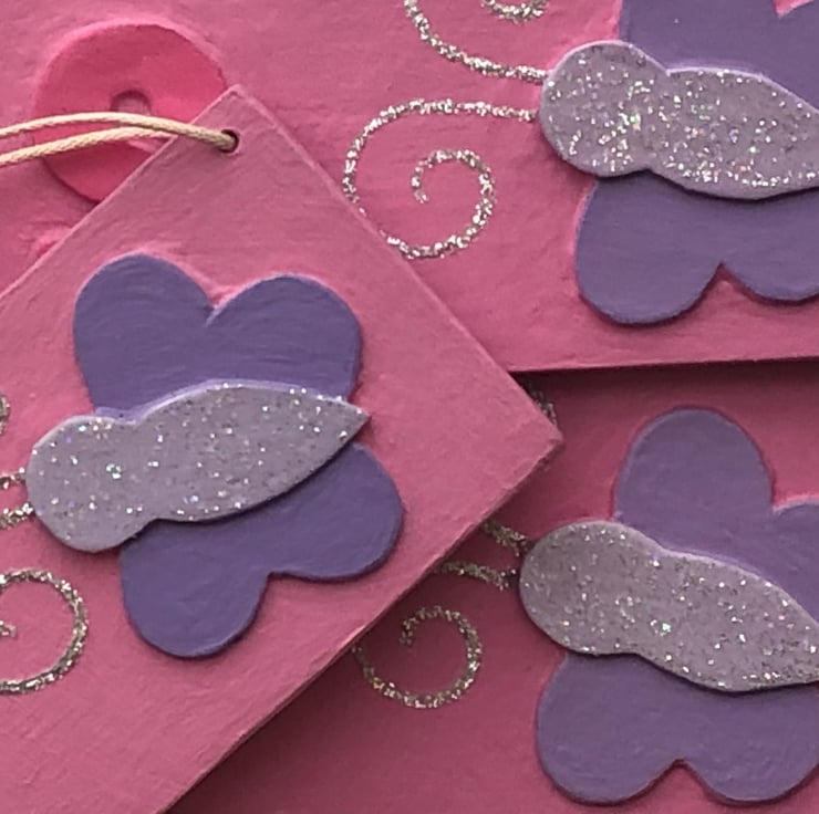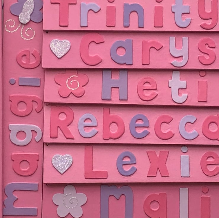 Small personalised butterfly themed name plate in baby pink measuring 29cm x 5 cm, strung with matching cord and coordinating star shaped beads, available with up to seven letters.