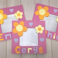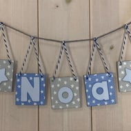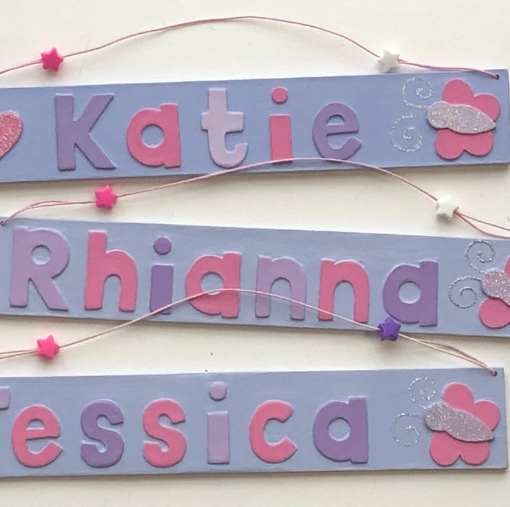Small personalised flower themed name plate in lilac measuring 29cm x 5 cm, strung with matching cord and coordinating star shaped beads, available with up to seven letters.