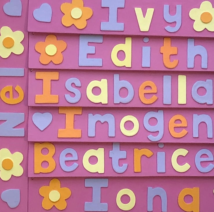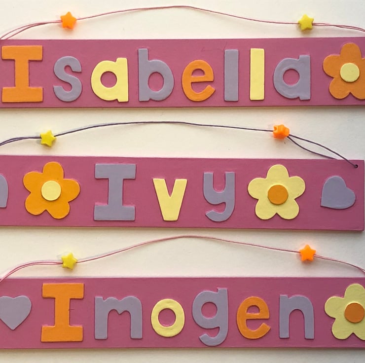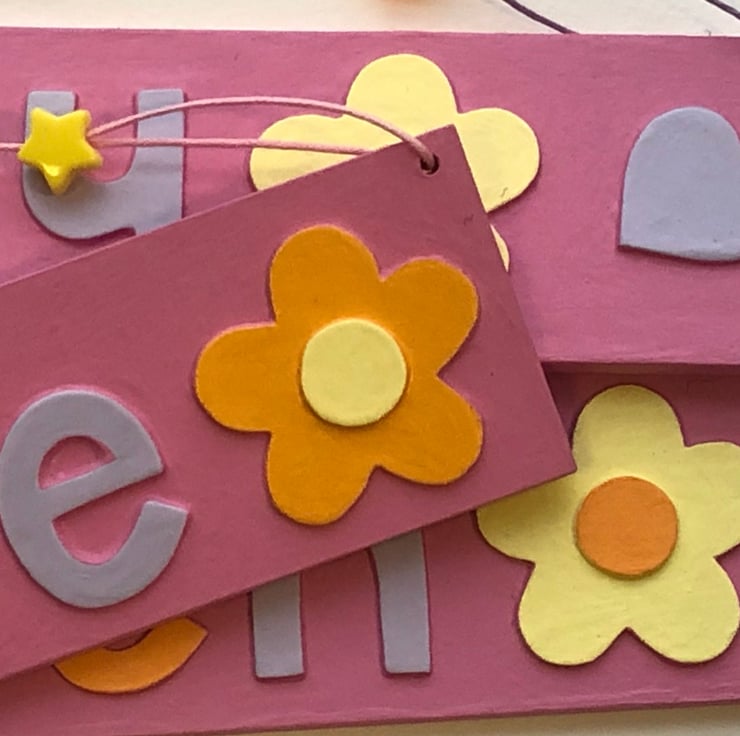 Small personalised flower themed name plate in baby pink measuring 29cm x 5 cm, strung with matching cord and coordinating star shaped beads, available with up to seven letters.