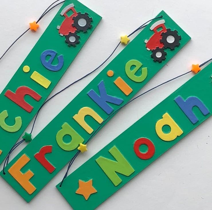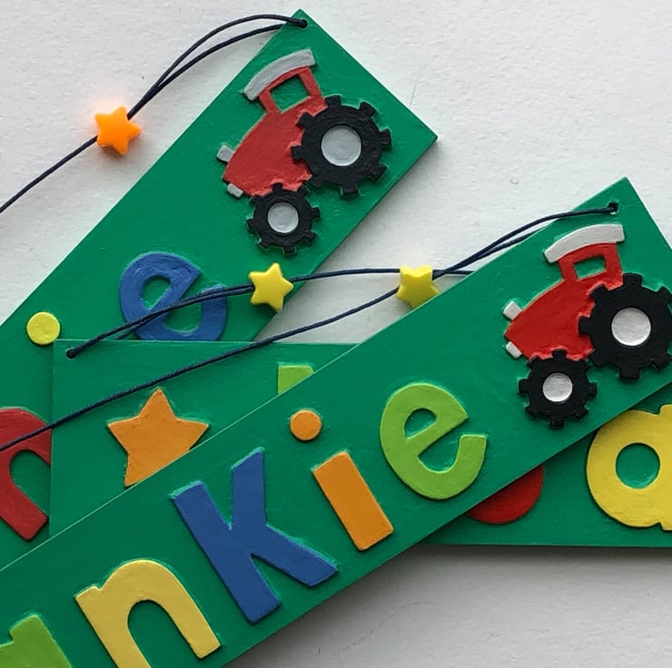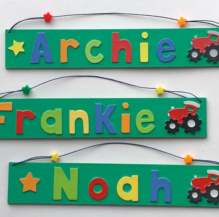 Small personalised tractor themed name plate in green measuring 29cm x 5 cm, strung with matching cord and coordinating star shaped beads, available with up to seven letters.