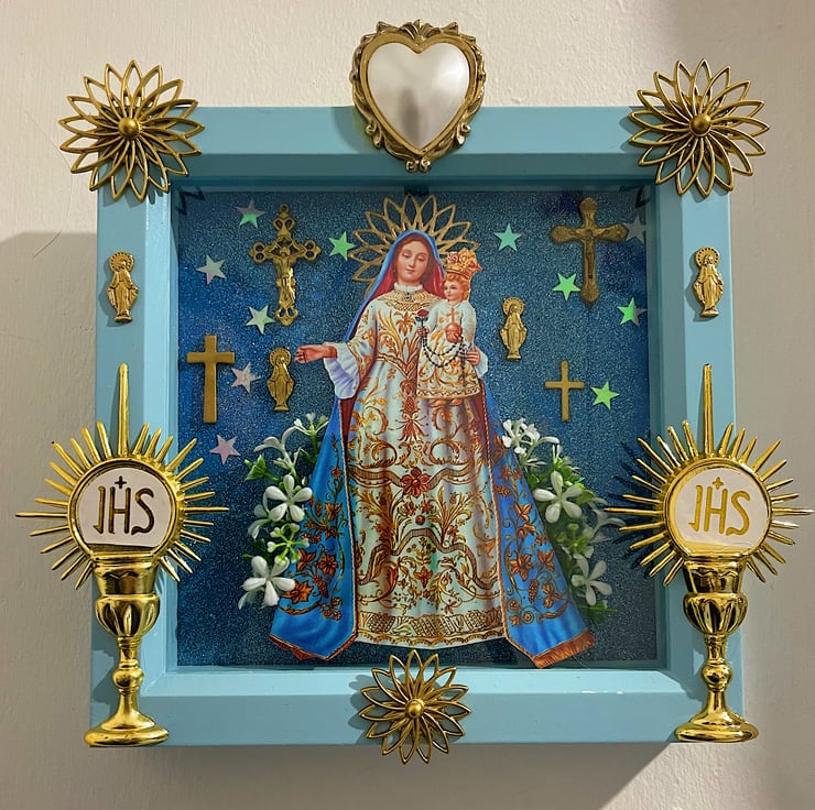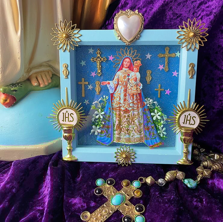 The Holy Madonna in the shrine is adorned with vintage crucifixes and charms