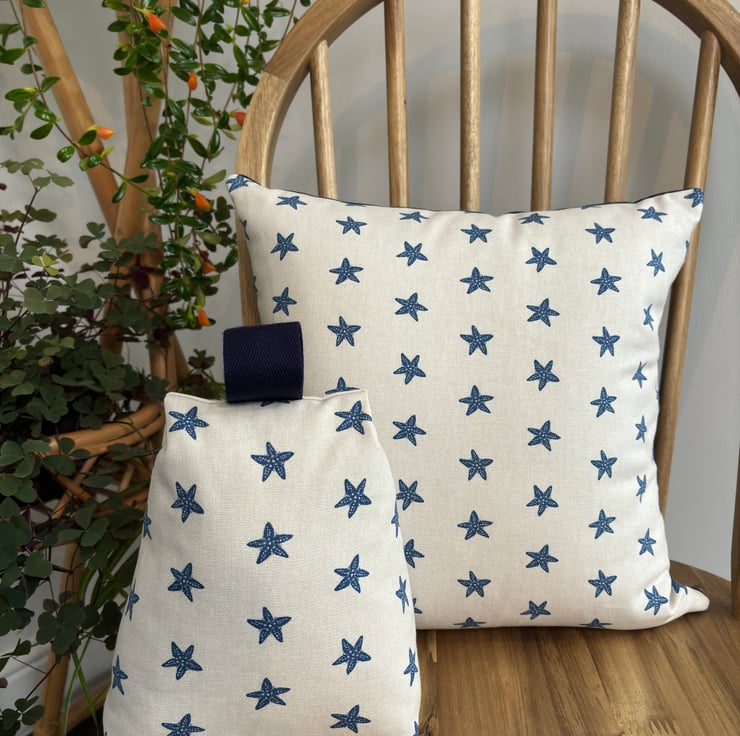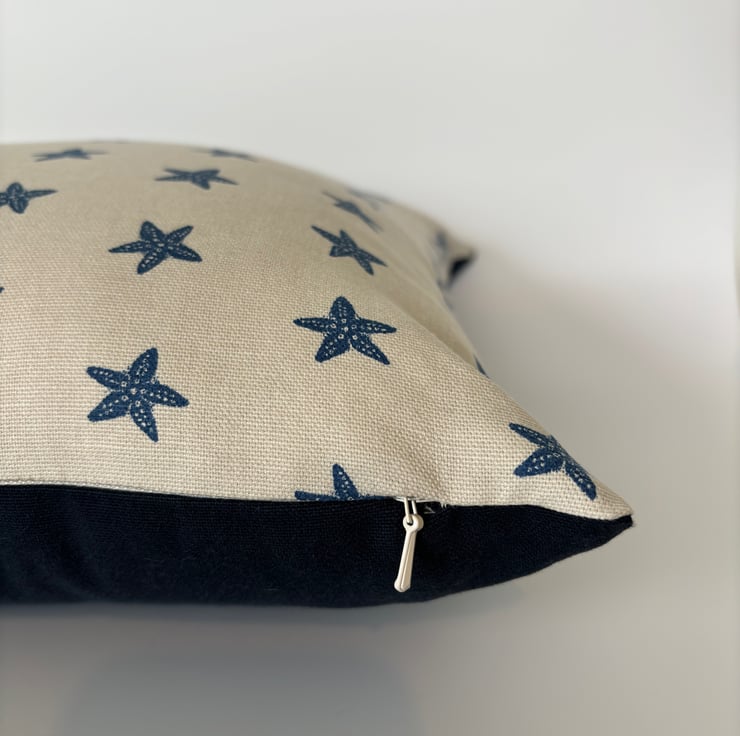 Nautical style taupe cushion cover with a navy starfish print. A fun twist on a classic design in a quality cotton fabric from Studio G. The cushion is backed with a soft plain cotton in navy and is finished with an invisible zip.