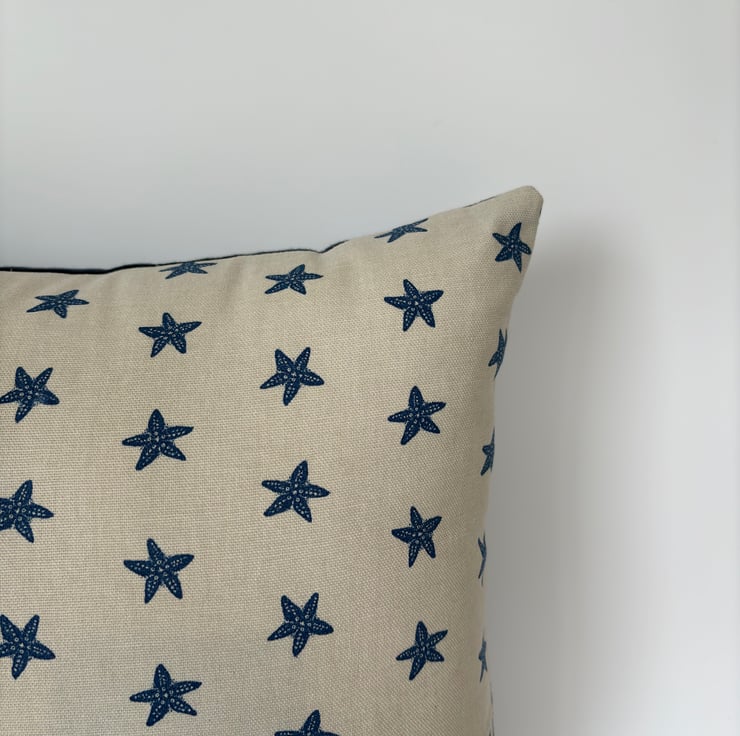 Cushion cover in taupe with navy starfish print, 36cm x 36cm.