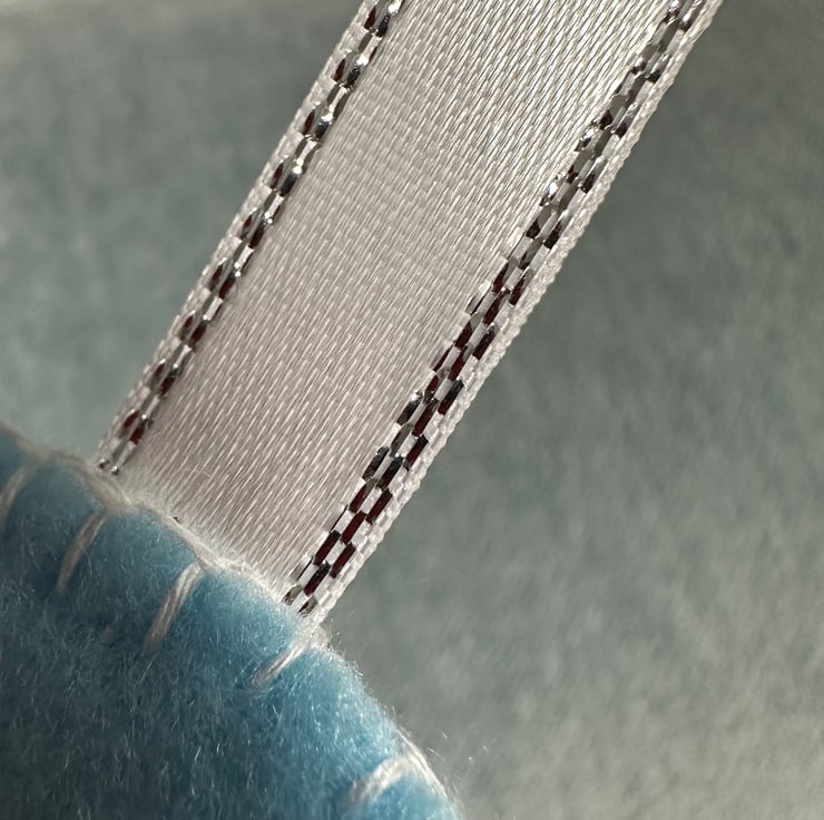 In soft pale blue high wool content felt with abstract designs they colour match perfectly. Both have a matching shiny white ribbon with silver thread running through.