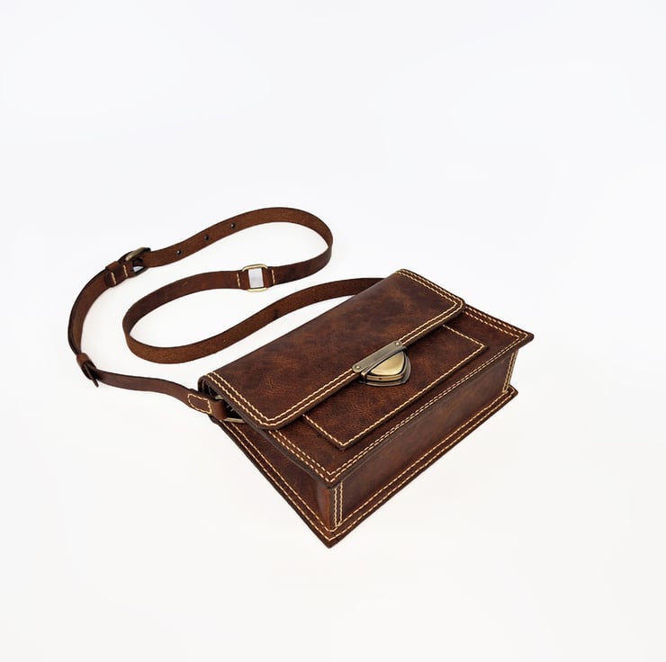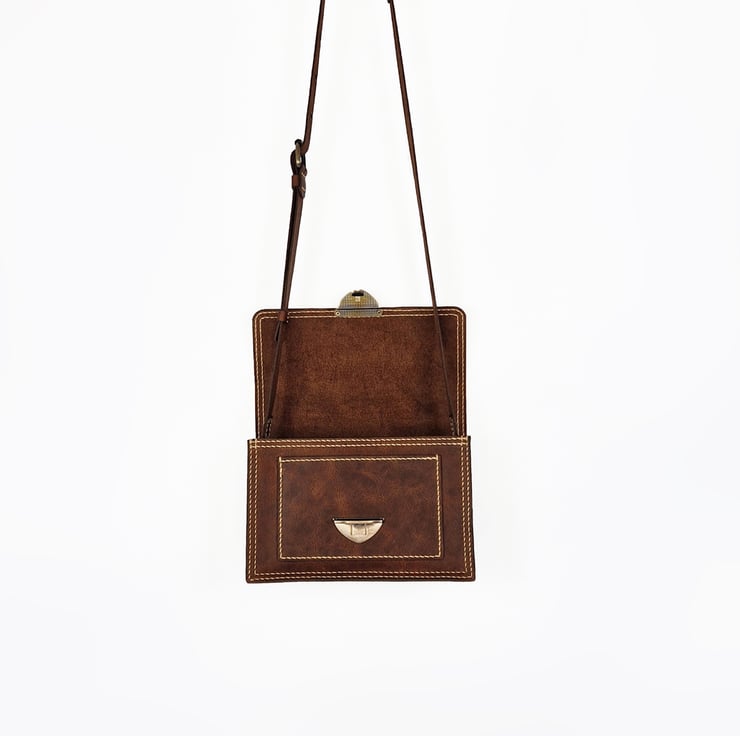 This brown bag is made from genuine leather with a pull-up effect and has contrast stitching. This small bag is perfect for everyday use.