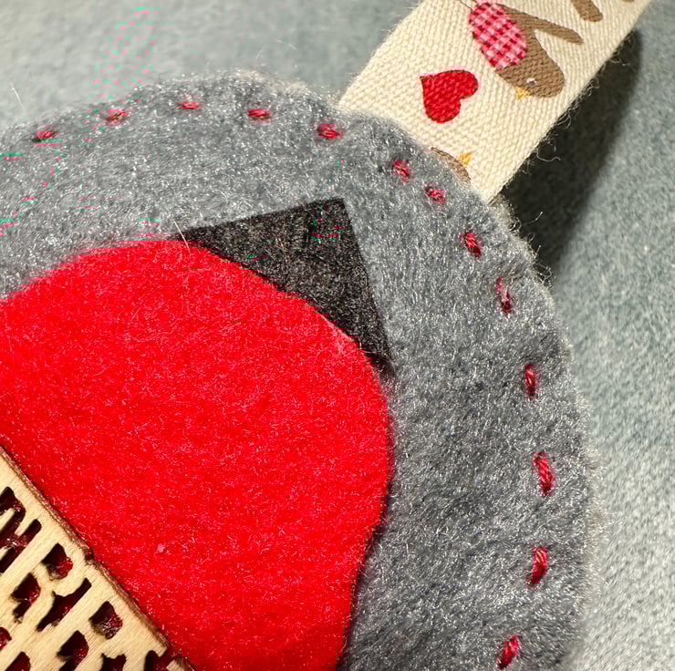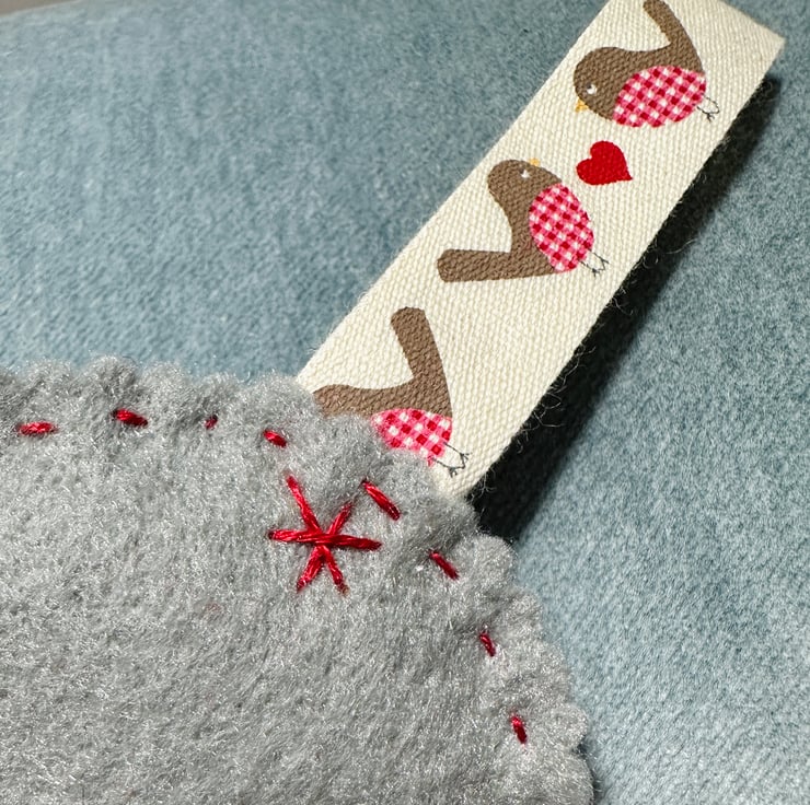 In soft grey and red high wool content felt with abstract designs they colour match perfectly. Both have a matching wooden Merry Christmas embellishment and the cutest cotton ribbon with robins on it.