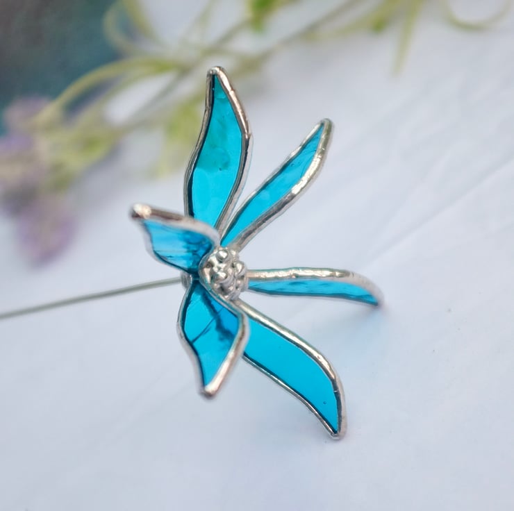 Stained Glass Flower - Handmade 3D Blue Clematis - Silver Finish
