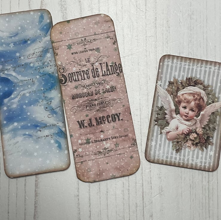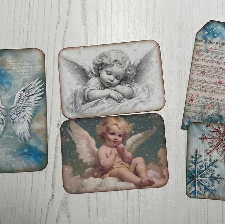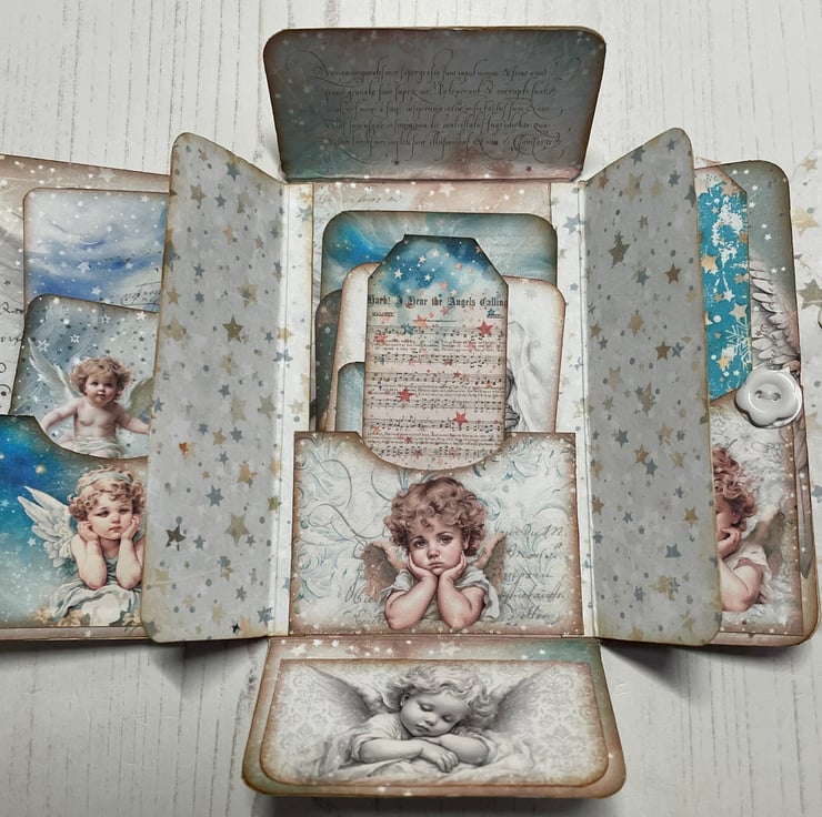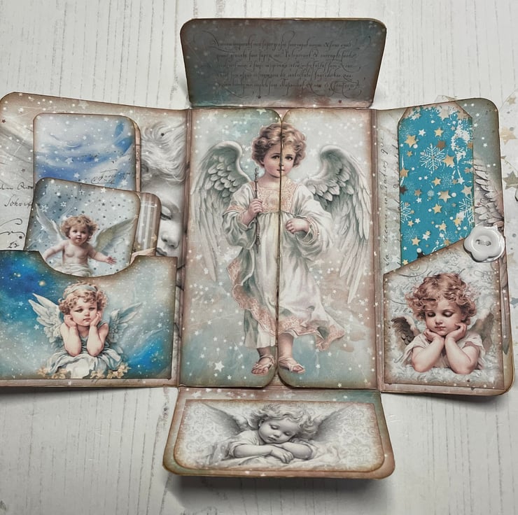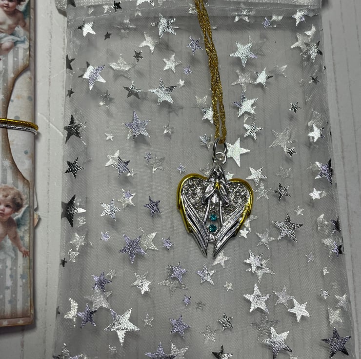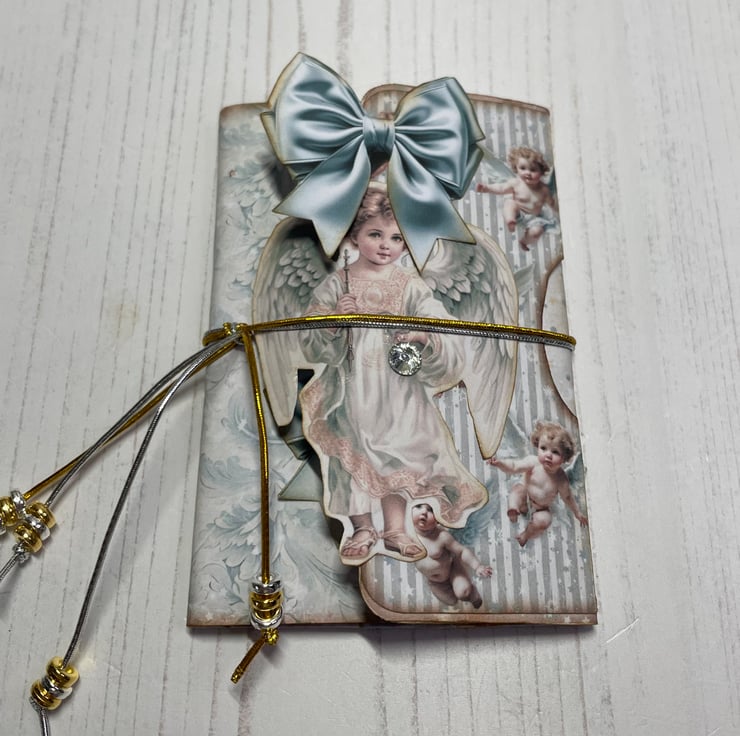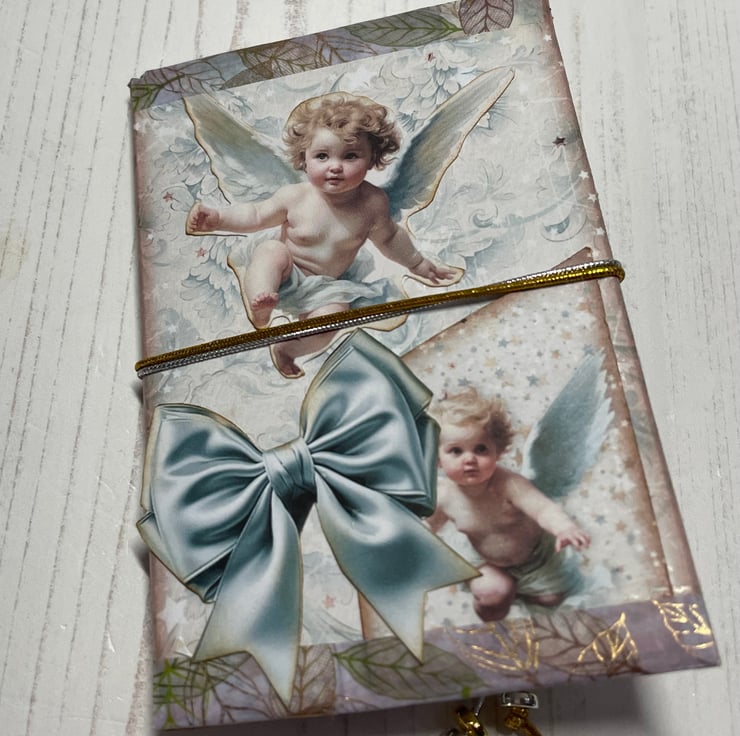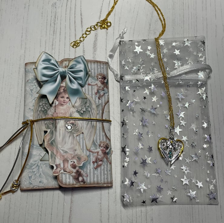 Delightful mini folder measuring approx 4.25” x 3”. In shade of blue and white. Front flap has an angel, paper bow and diamanté. Gold and silver elastic cord with bead ends for closure. Opens to reveal 2 pockets. Centre section opens to reveal a further pocket, pockets filled with 9 tags. Back cover has a cherub and mini cherub printed pocket. Also included a beautiful angel charm on a 20” chain plus extension chain. In gold and silver plated with turquoise stones. Perfect for a person who is unwell or anyone that believes in angels.