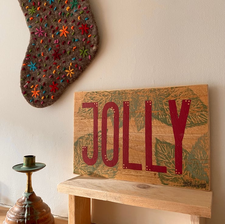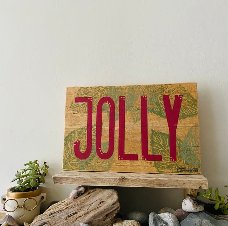 Apple leaf wooden sign with JOLLY in vibrant red lettering finished with bronze highlights.