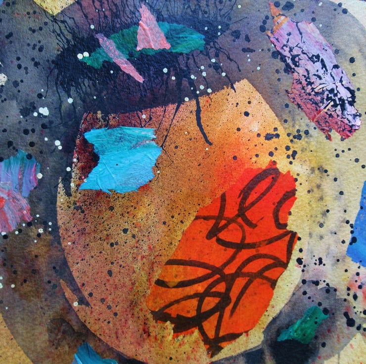 Striking abstract artwork in watercolour, ink, collage and powder pigment paint on heavy watercolour paper. Measuring a smidgen over 9 x 12 inches, this is an attractive artwork which although looks quite minimal, actually has lots going on, with it's beautiful colour nuances, paint drifts, rivulets and splashes. It will be signed on the front by Bea before shipping and it comes to you unframed. (Framed photo is for illustrative purposes only.)