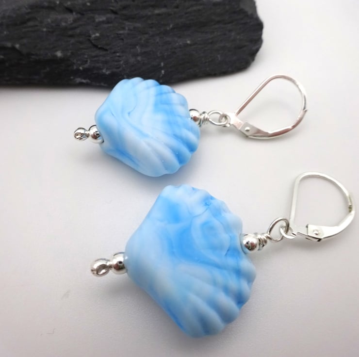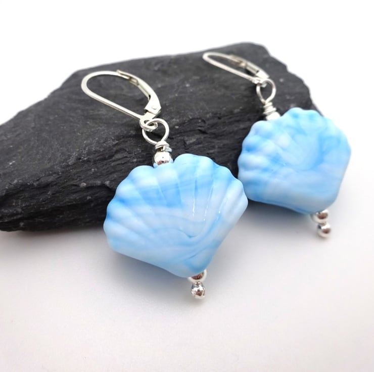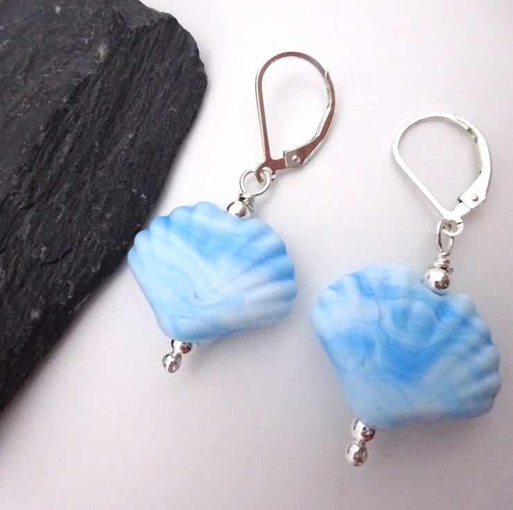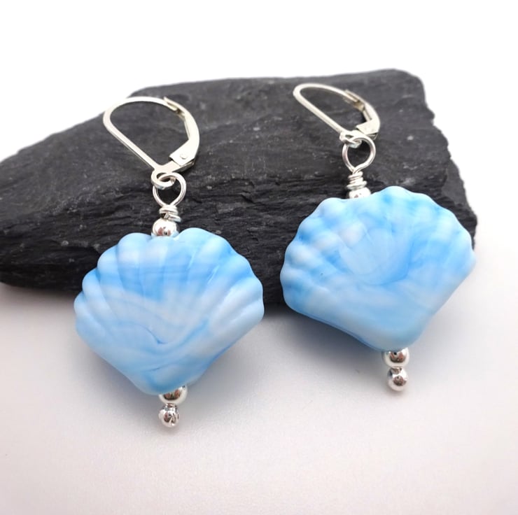 A pair of earrings made with sterling silver lever back ear wires, sterling silver beads and handmade lampwork glass sea shell beads made with blue glass.