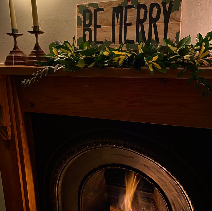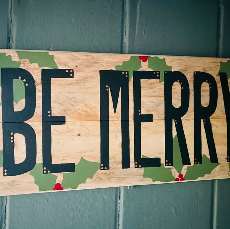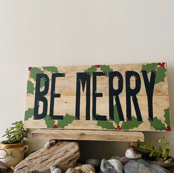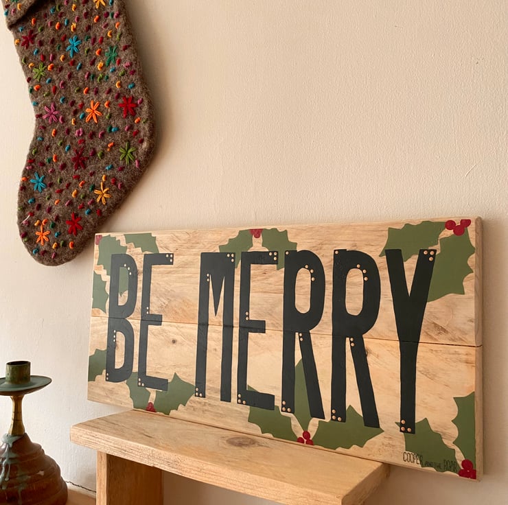 Holly leaf wooden sign in green and dark BE MERRY with bronze highlight
