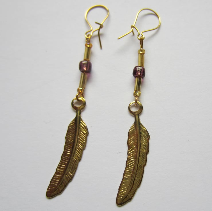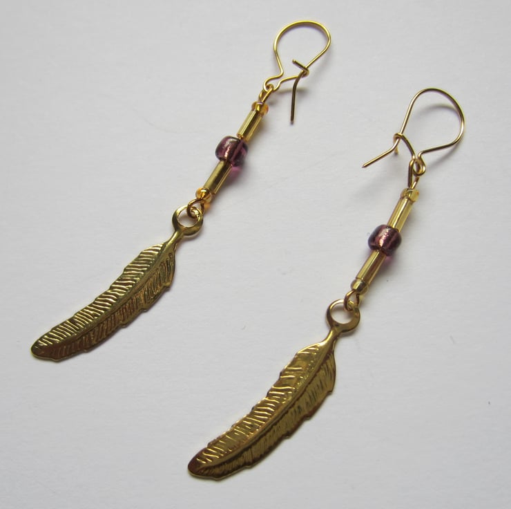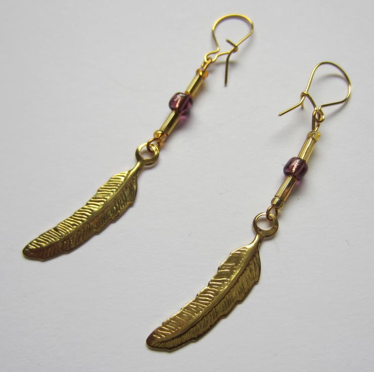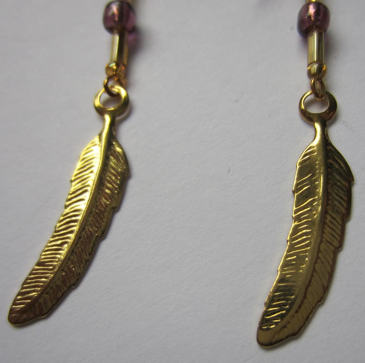 Pair of dangle earrings made with gold coloured feather charms and purple and gold tone beads. They hang with gold plated ear wires.