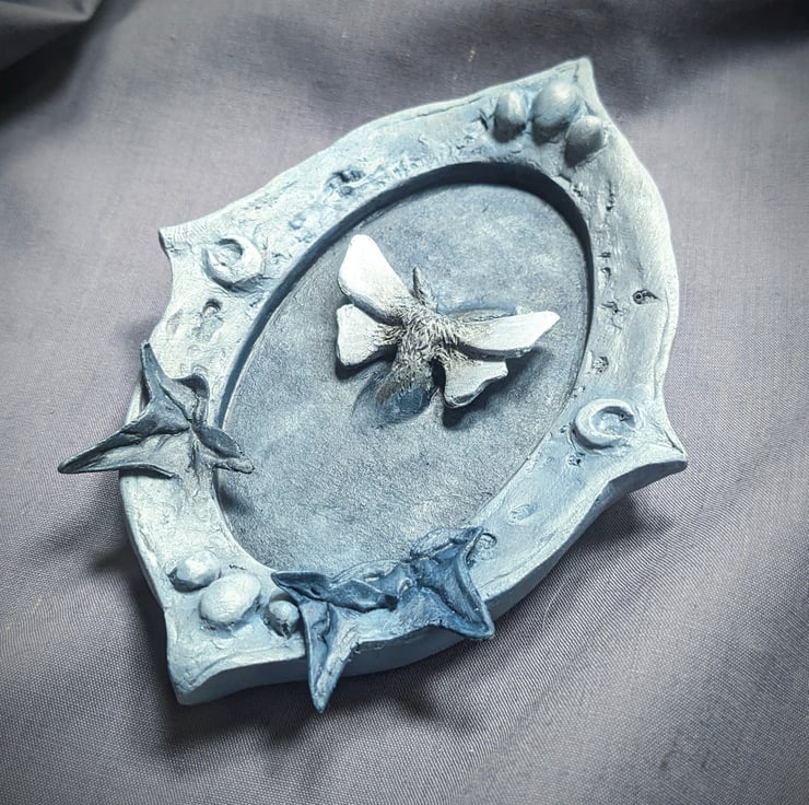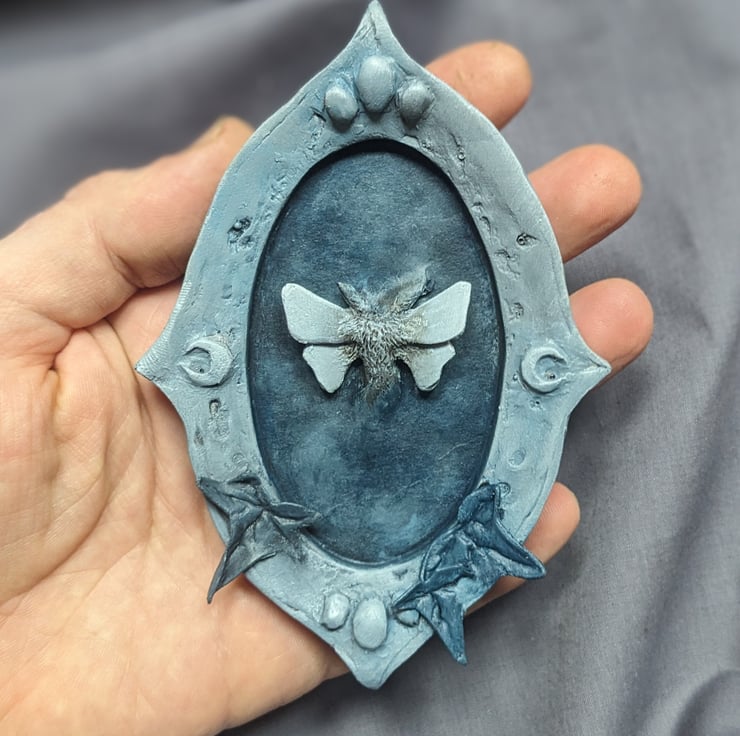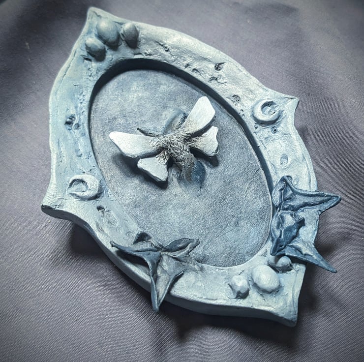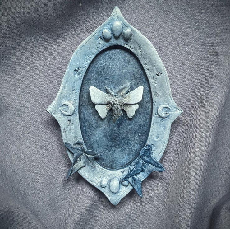 The symbolism of mirrors is an interesting idea to play with, although it doesn't have an actual mirror plate in, the surface of the mirror is meant to offer up the idea that mirrors are gateways to an unseen world. With in the Pale House they are small doorways where moths, ivy and flowers burst forth, bathed in a gentle glow, akin to moon light.