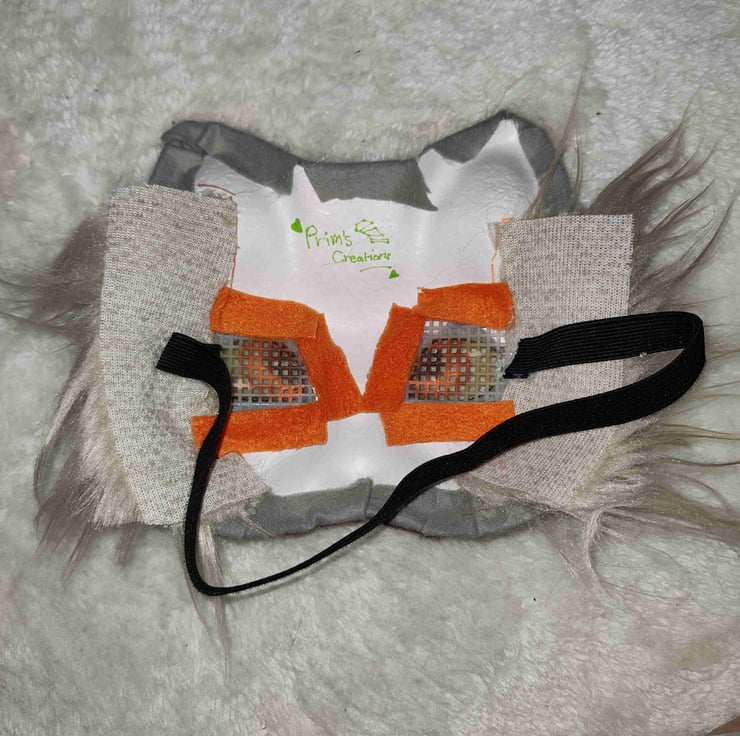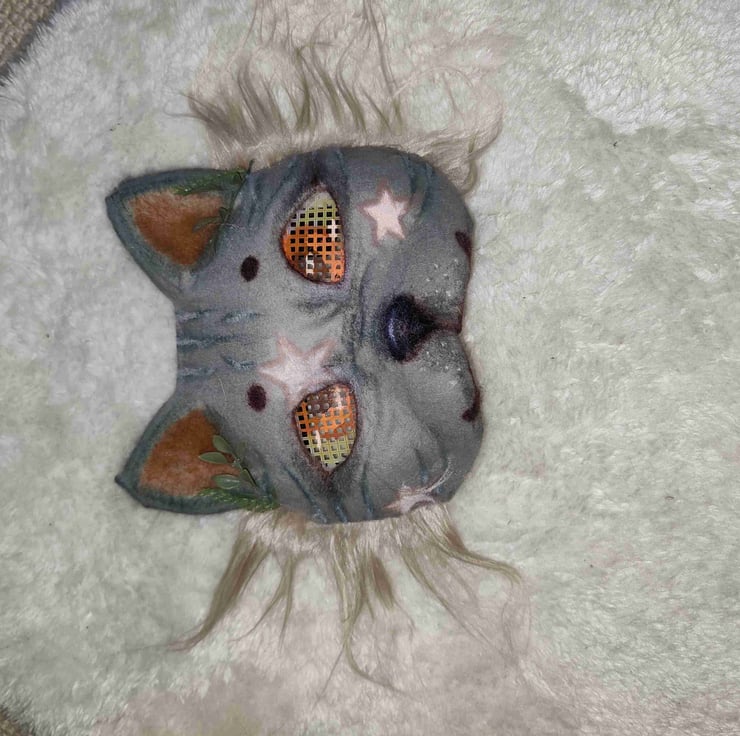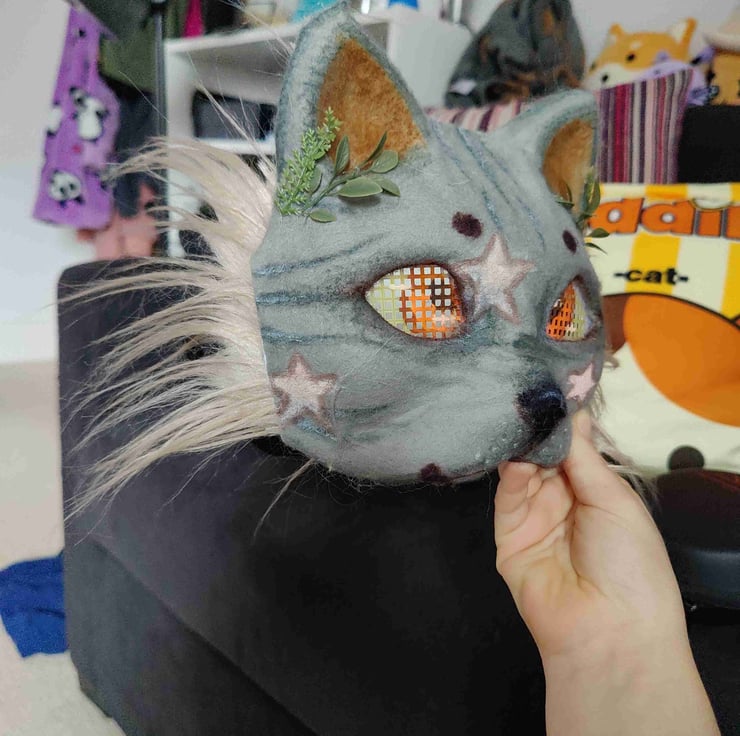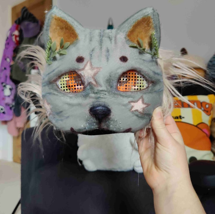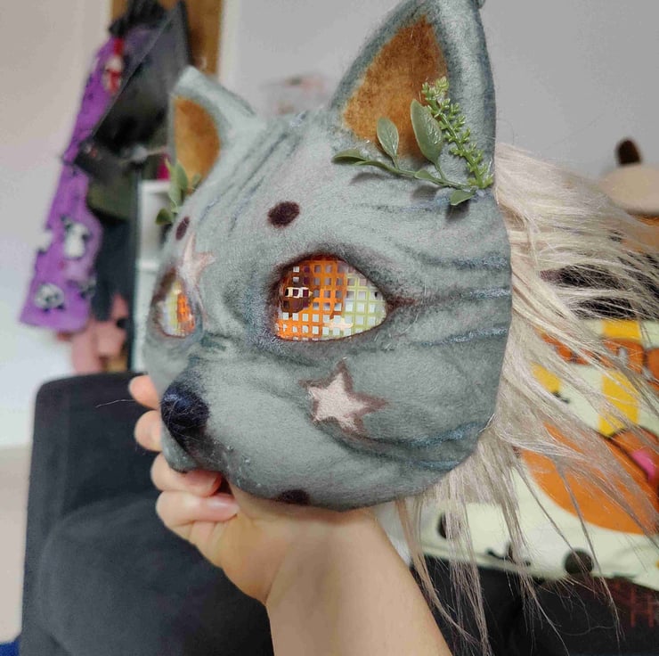 This hand-made cat mask represents a grey cat with amber eyes and decorative leaves with decorative stars and fur at the sides! The mask base, mesh, fur and markers used were all from Amazon, with the plastic leaves and felt sourced from small shops around my town! Holes in the mesh allow great sight and should have a comfortable rest with fabric around the rim to prevent any spiky edges getting in the way! My tag is also written on the inside :)