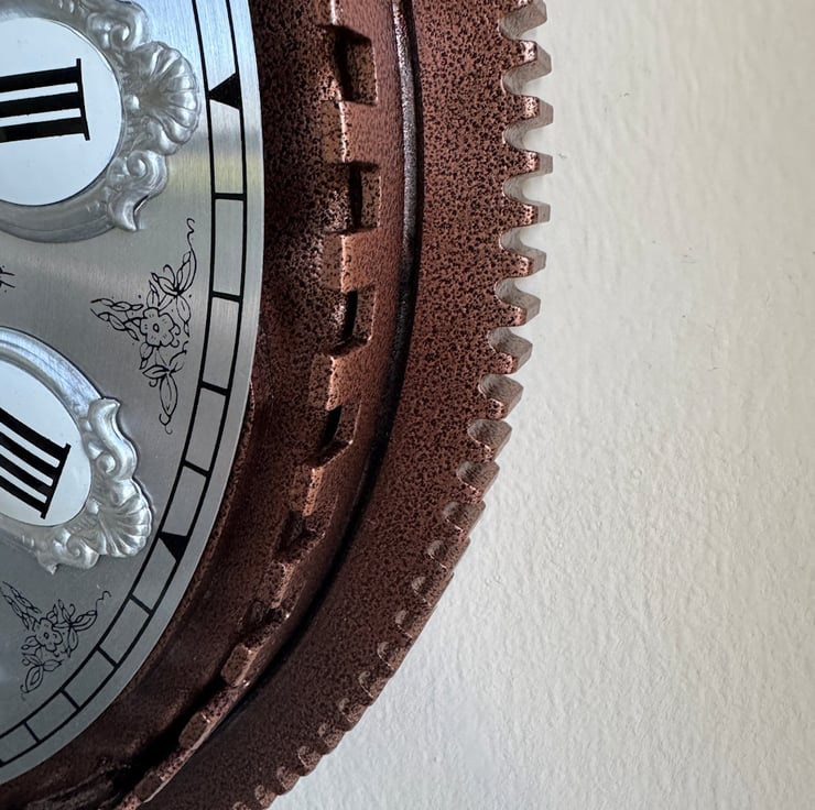 This steampunk clock is a captivating and unique piece with a diameter of 300mm. It is ingeniously crafted from a Mercedes flex plate, giving it an automotive-inspired foundation. The surface of the flex plate has been powder-coated in an antique gold finish, adding an elegant, vintage texture that highlights the industrial theme while remaining quiet due to its silent mechanism.