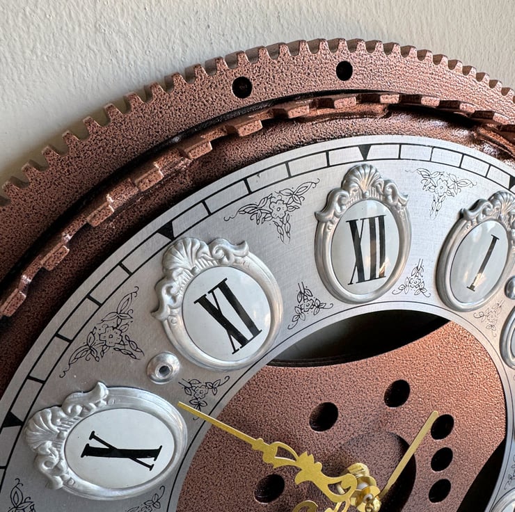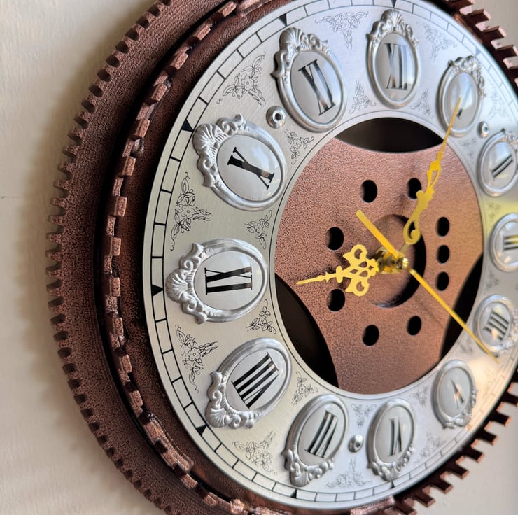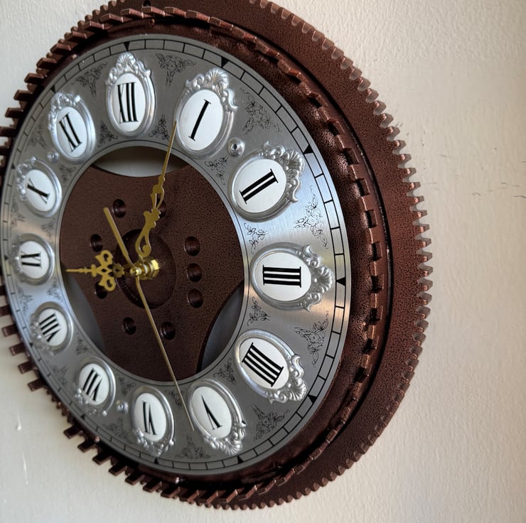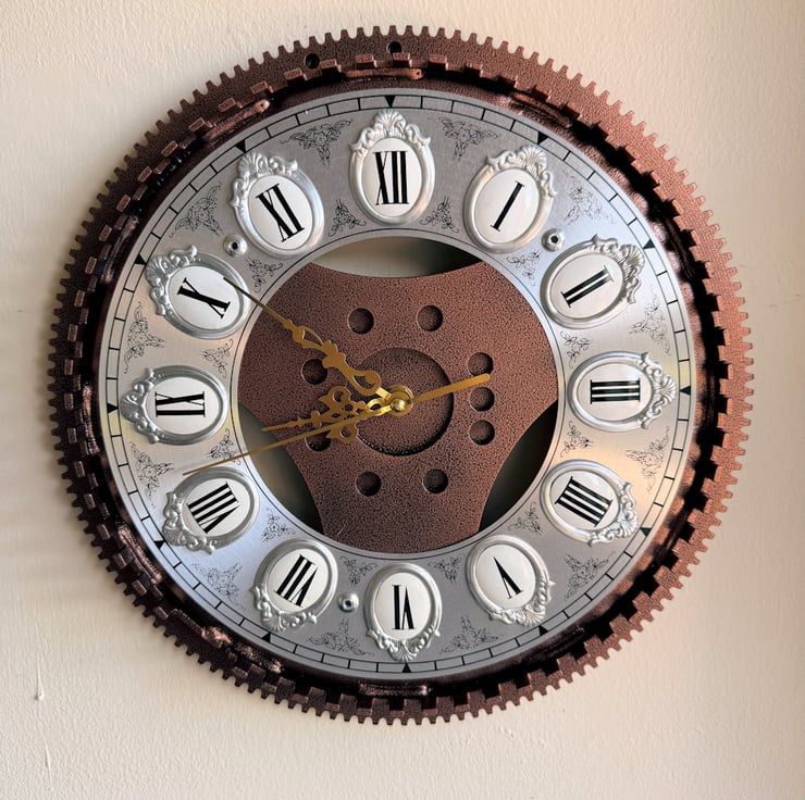 This steampunk clock is a captivating and unique piece with a diameter of 300mm. It is ingeniously crafted from a Mercedes flex plate, giving it an automotive-inspired foundation. The surface of the flex plate has been powder-coated in an antique gold finish, adding an elegant, vintage texture that highlights the industrial theme while remaining quiet due to its silent mechanism.