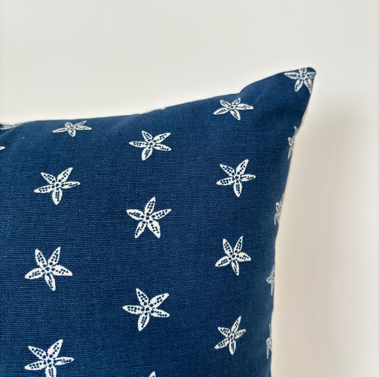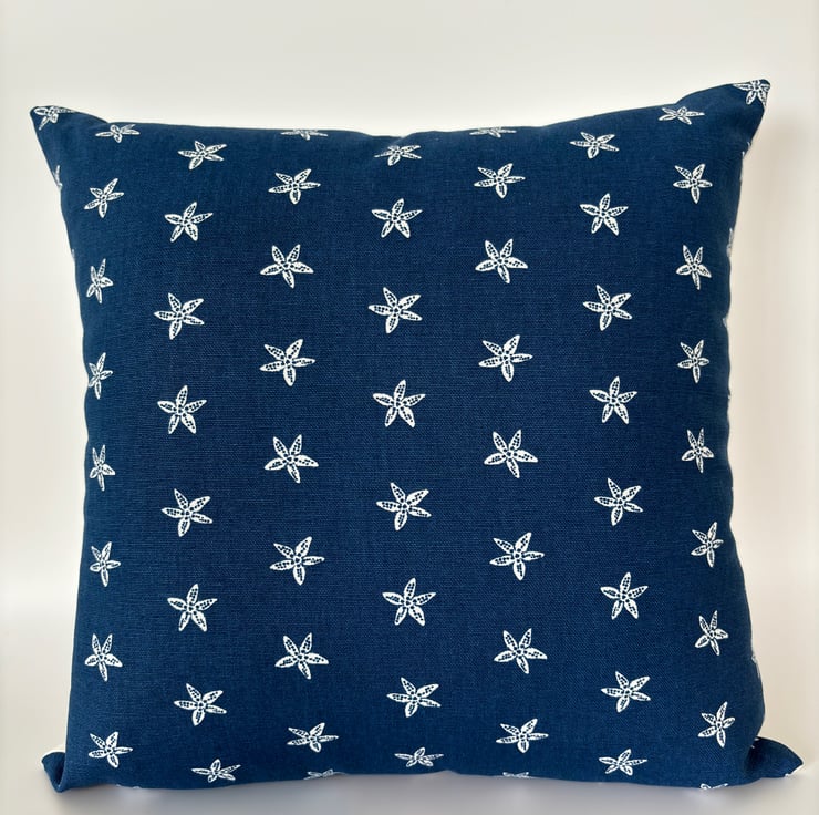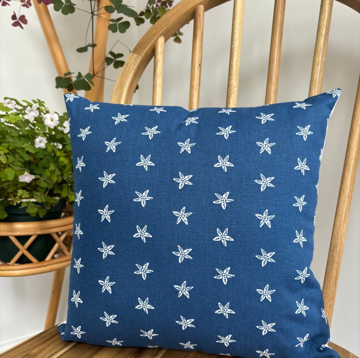 Cushion cover in navy with white starfish print, 36cm x 36cm