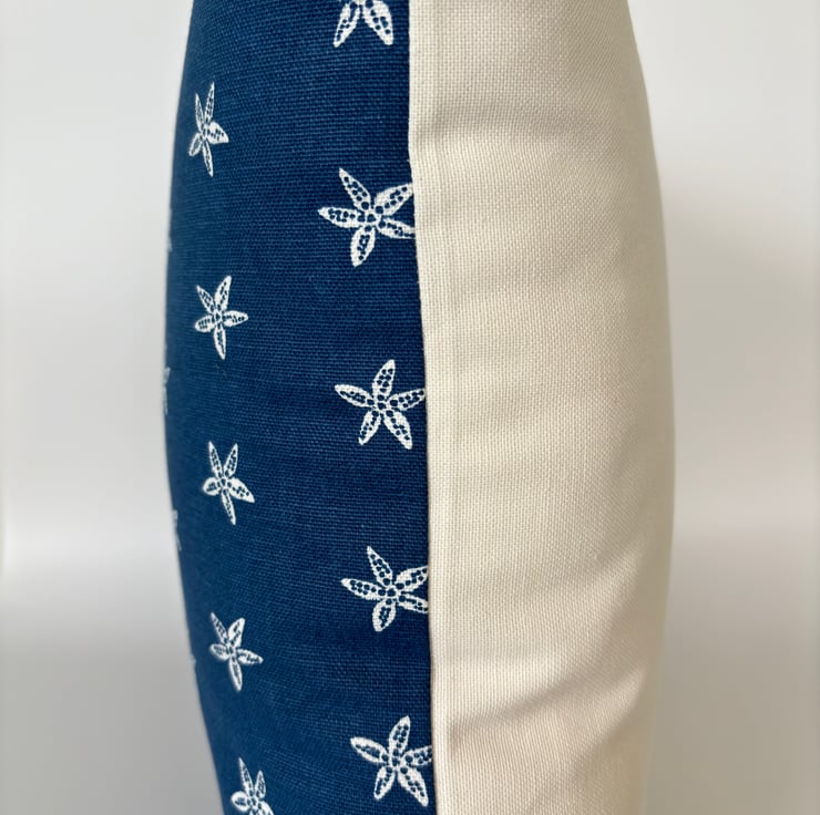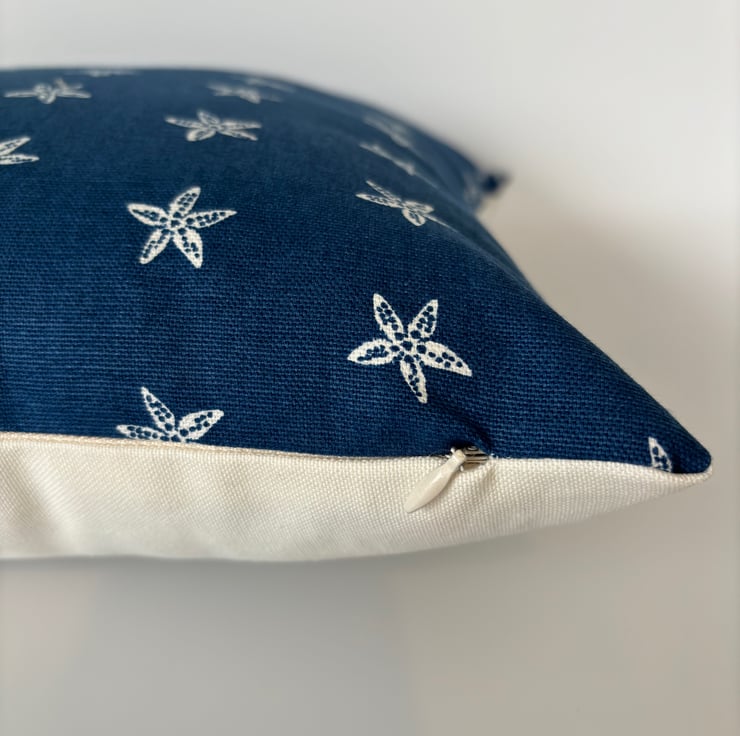 Nautical style navy cushion cover with a white starfish print. A fun twist on a classic design in a quality cotton fabric from Studio G. The cushion is backed with a soft plain cotton in ivory and is finished with an invisible zip.