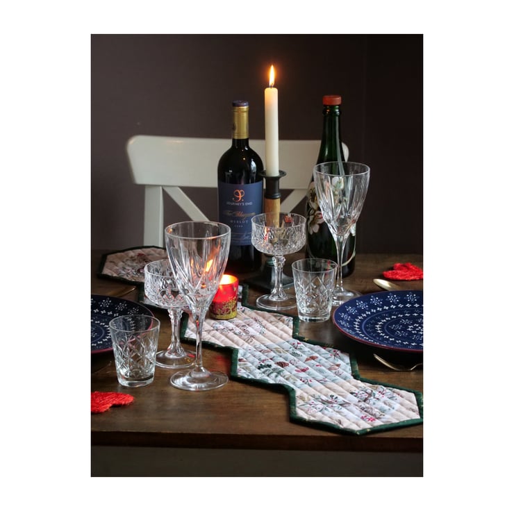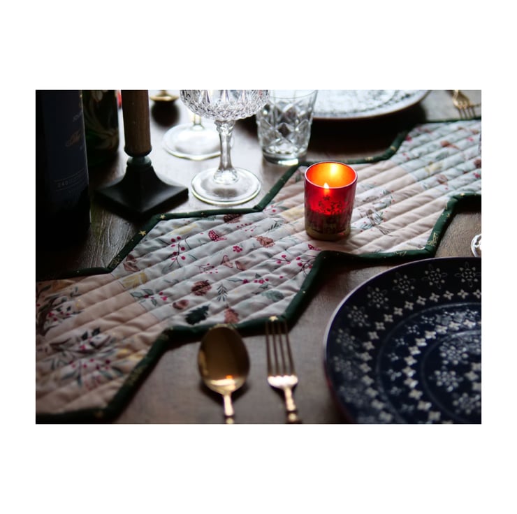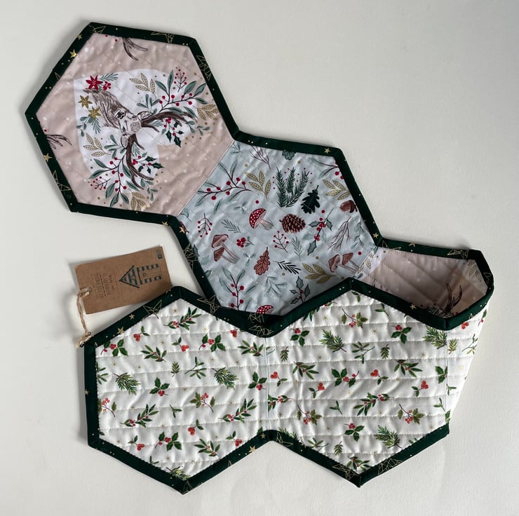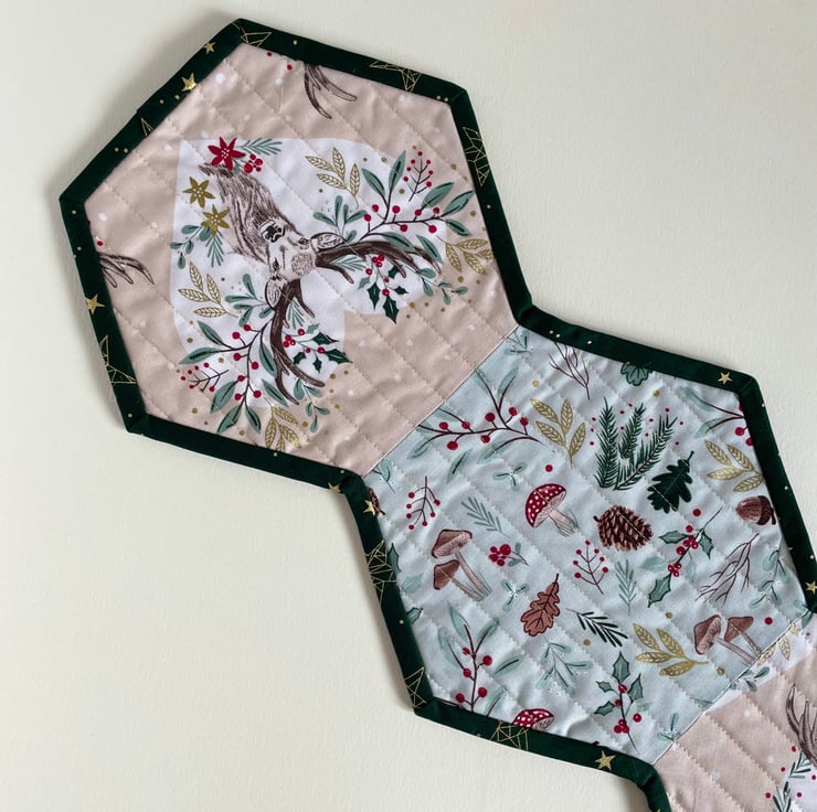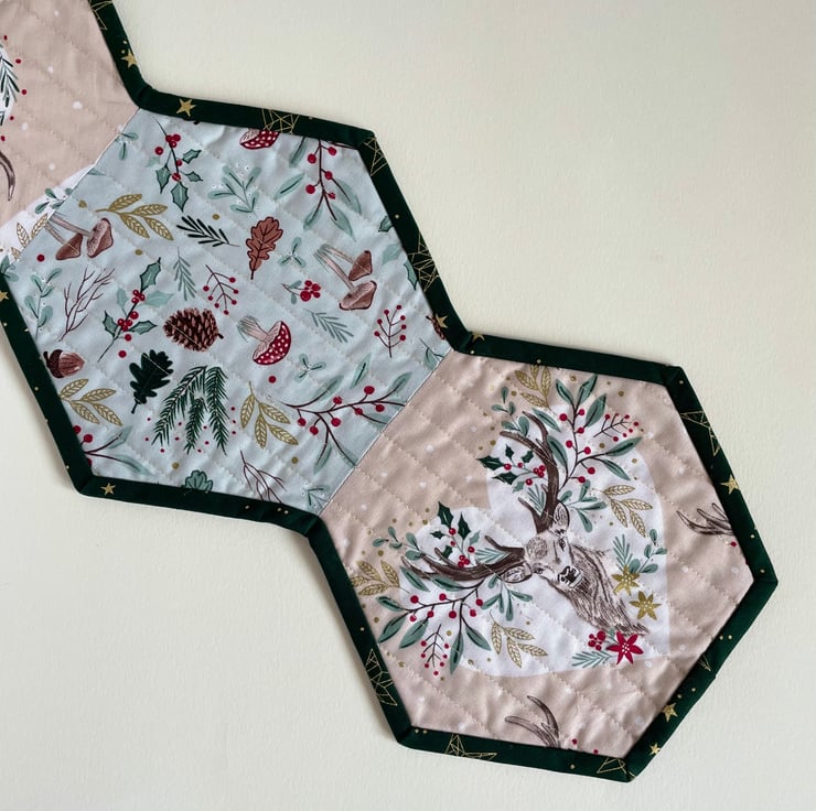 Christmas table runner with stags . 5 hexagons, quilted. Approx 89 cm long and the hexagons are 21 cm wide. See the photos.