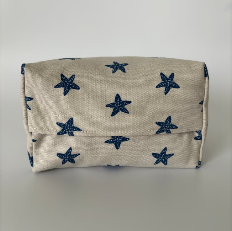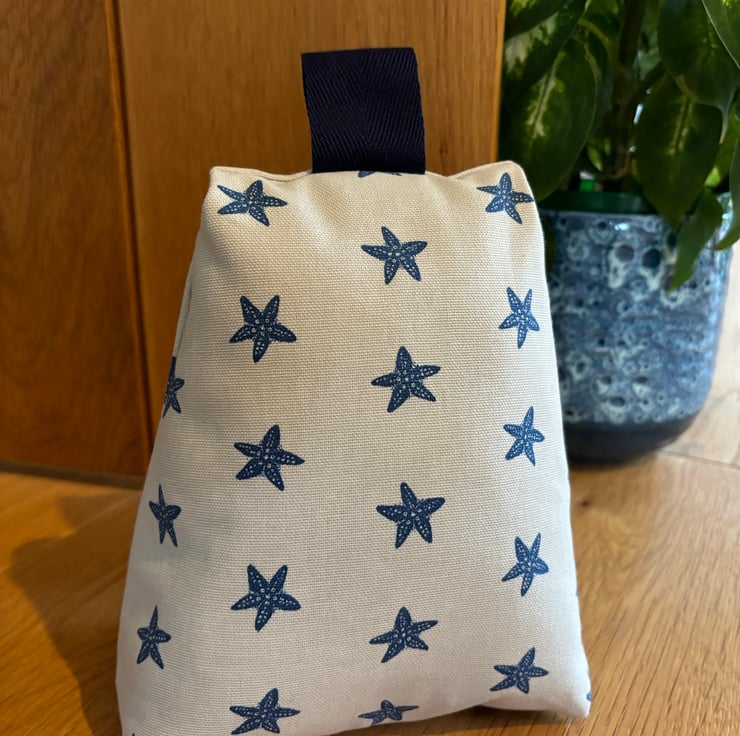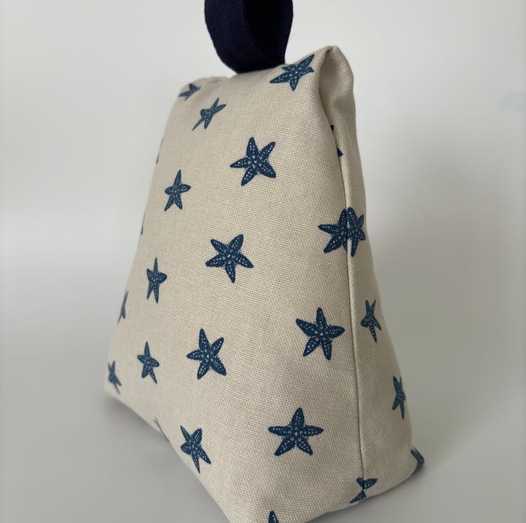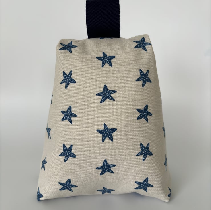 Handmade cotton fabric doorstop in a taupe and navy starfish print.