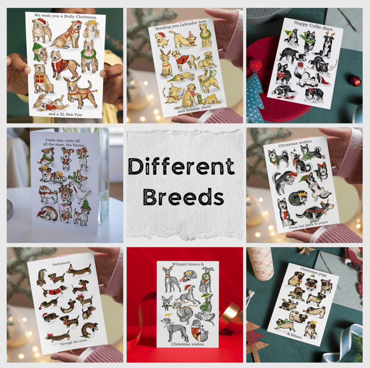 This Whippet Christmas card illustrates a beautiful Whippet in different poses with festive attire.