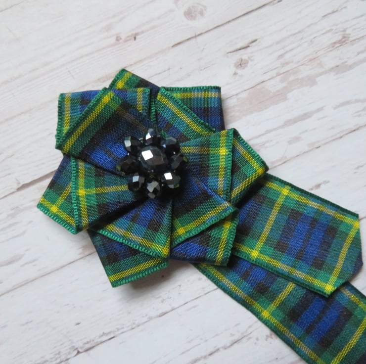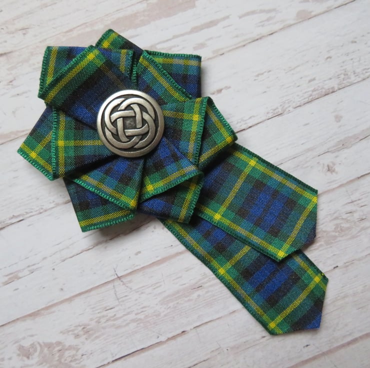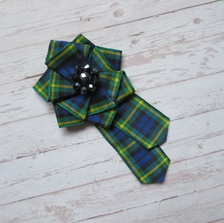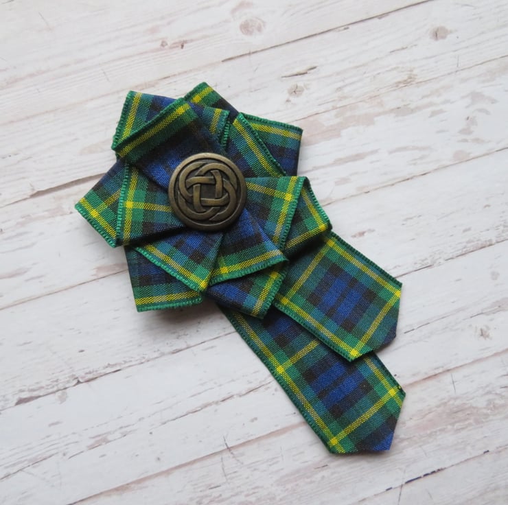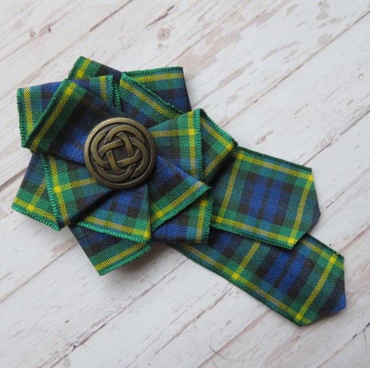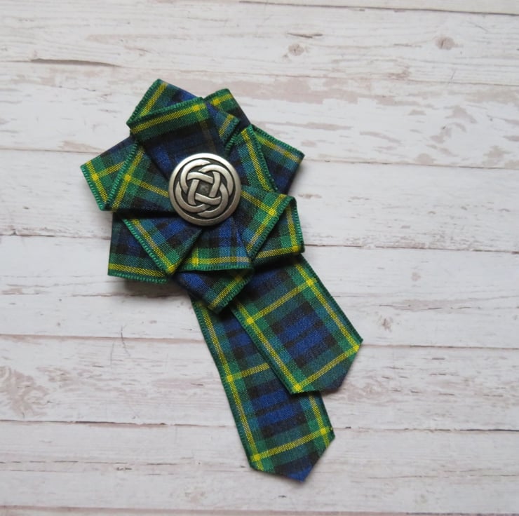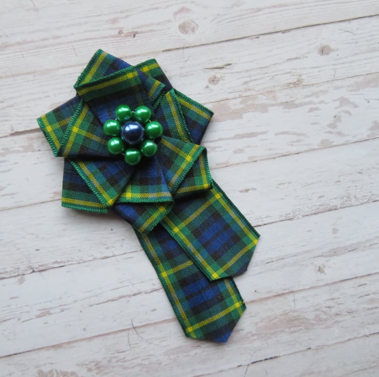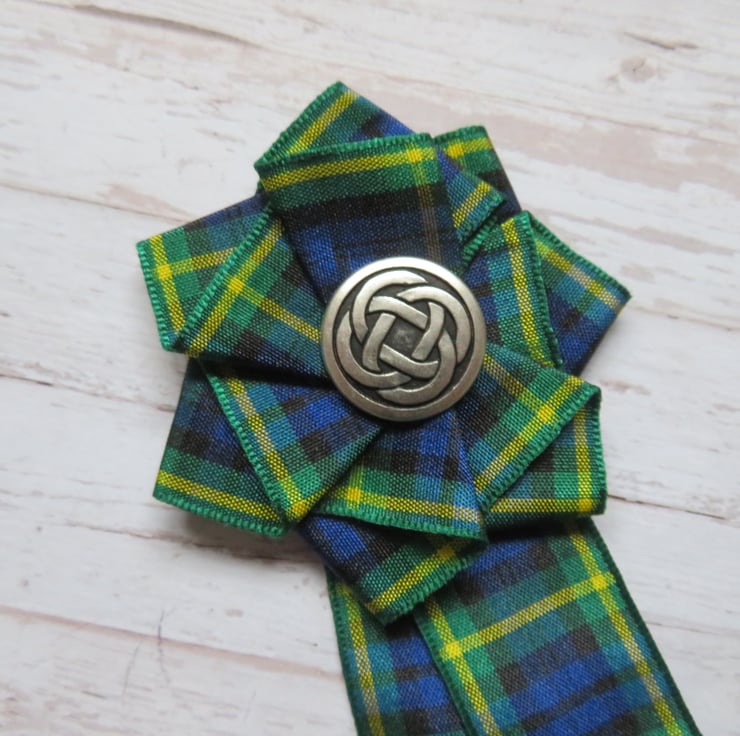 Made with a handmade and sewn ruffle of Gordon tartan ribbon with wide ribbon shaped trails and finished with a choice of different embellishments, including a round metal silver or brass antique finish Celtic pattern button, emerald green pearls or navy crystals,