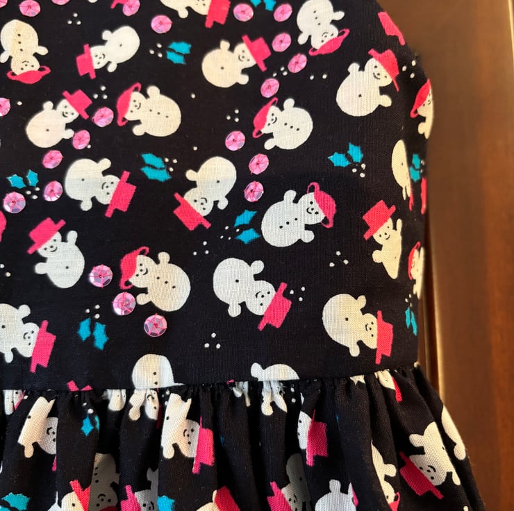 The dress is trimmed with a double row of bright pink spotty ribbon.