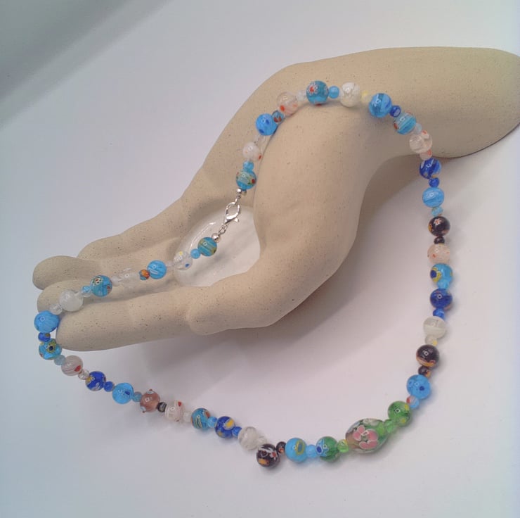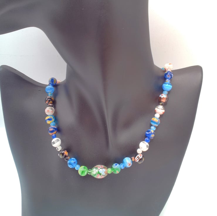 Blue Green and White Millefiori Bead Necklace, Millefiori Necklace, Beaded Necklace, Accessories, Birthday Gift, Anniversary Gift, Jewellery, Gift for Her
